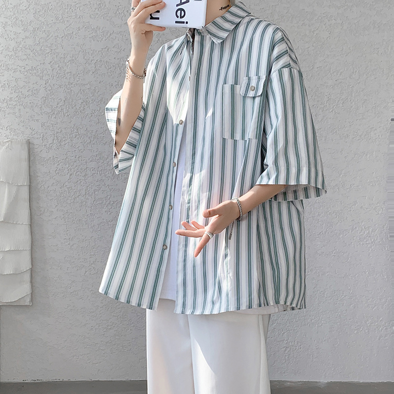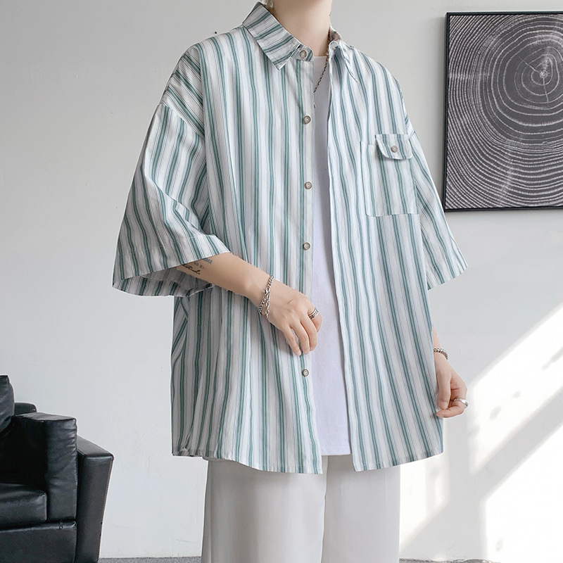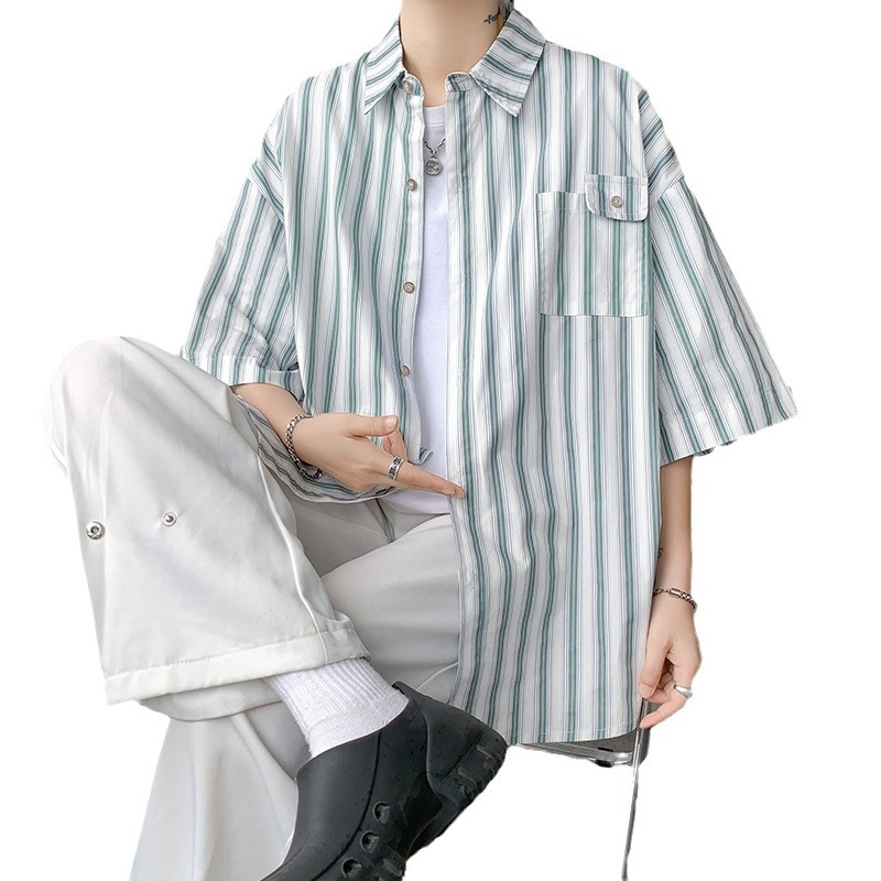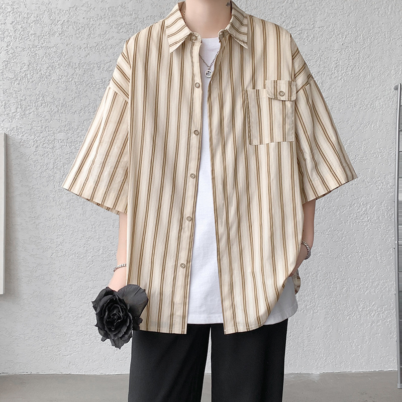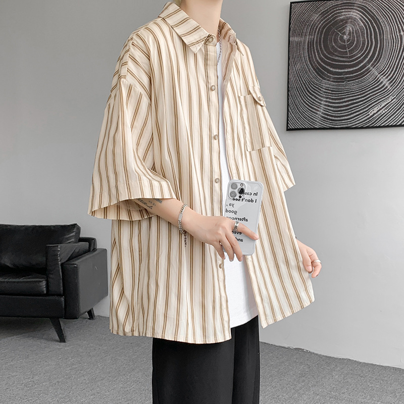 新款男士条纹短袖衬衫 大码宽松冰丝透气休闲衬衣男上衣