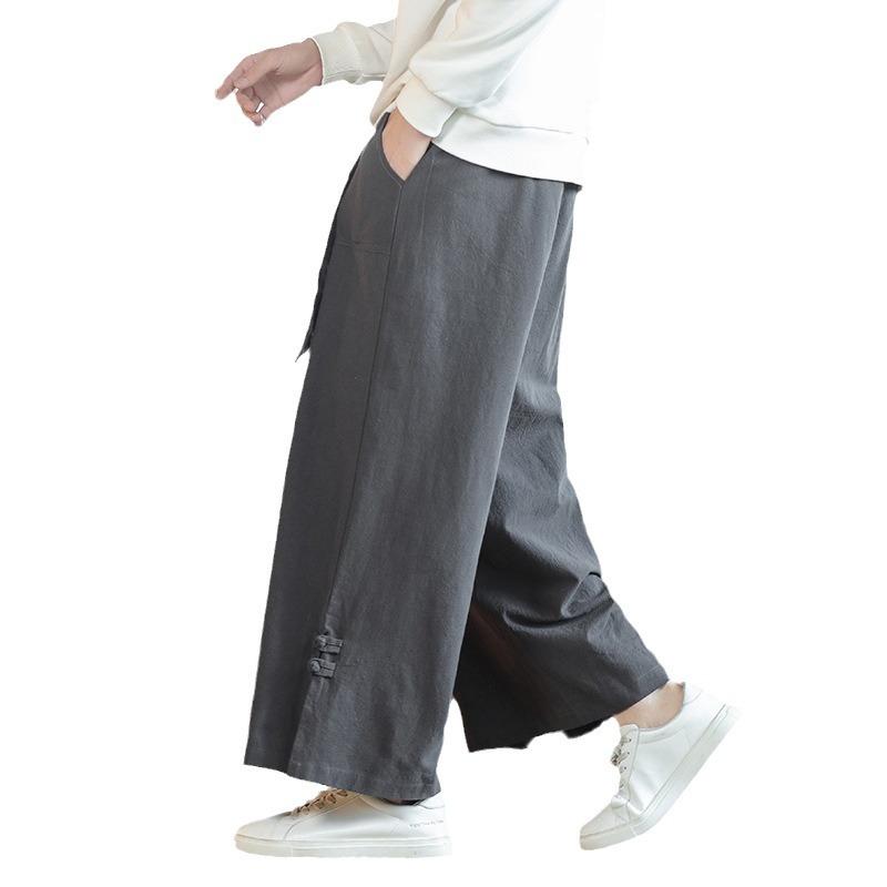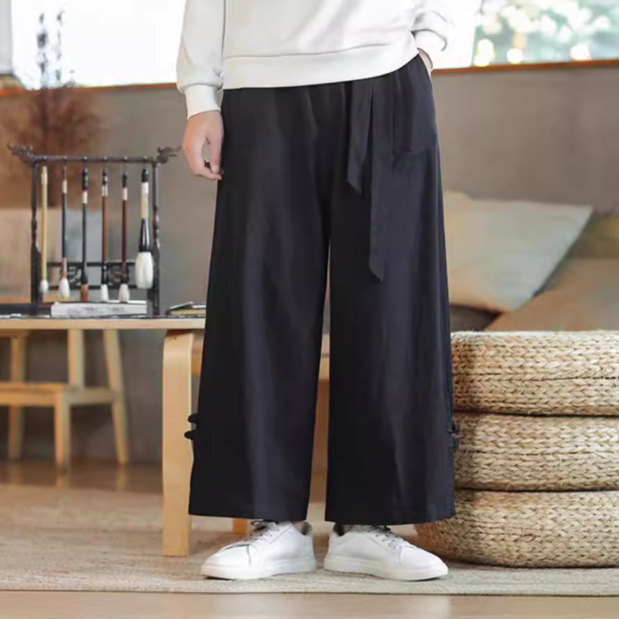 新中式男士休闲裤中国风棉麻宽松系绳直筒裤长裤男