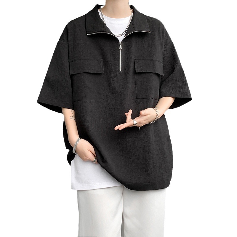 夏季新款男士短袖T恤 时尚小香风翻领压绉宽松拉链短袖T恤男