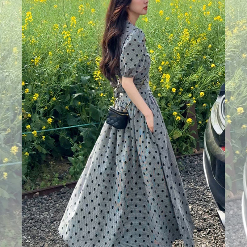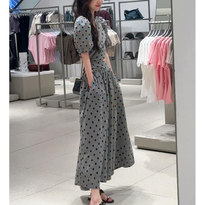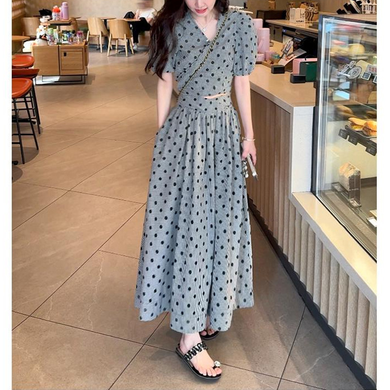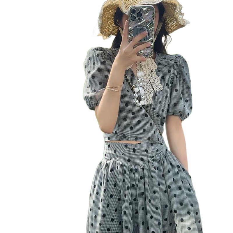 波点泡泡袖上衣半身裙质套装V领法式女夏季气质裙子