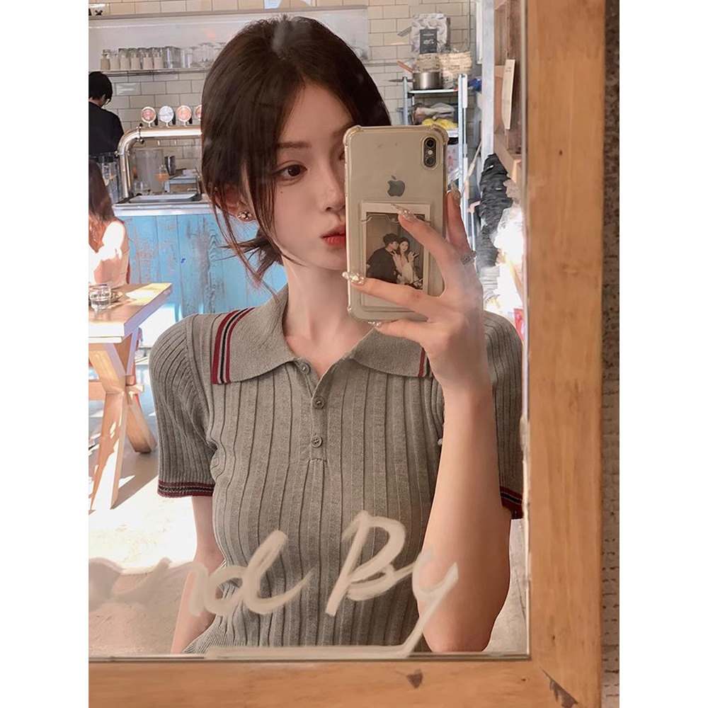College Grey Lapel Short Sleeve Ice Silk Knit Women's 2025 New Summer Slim Fit Small Man Crop Top