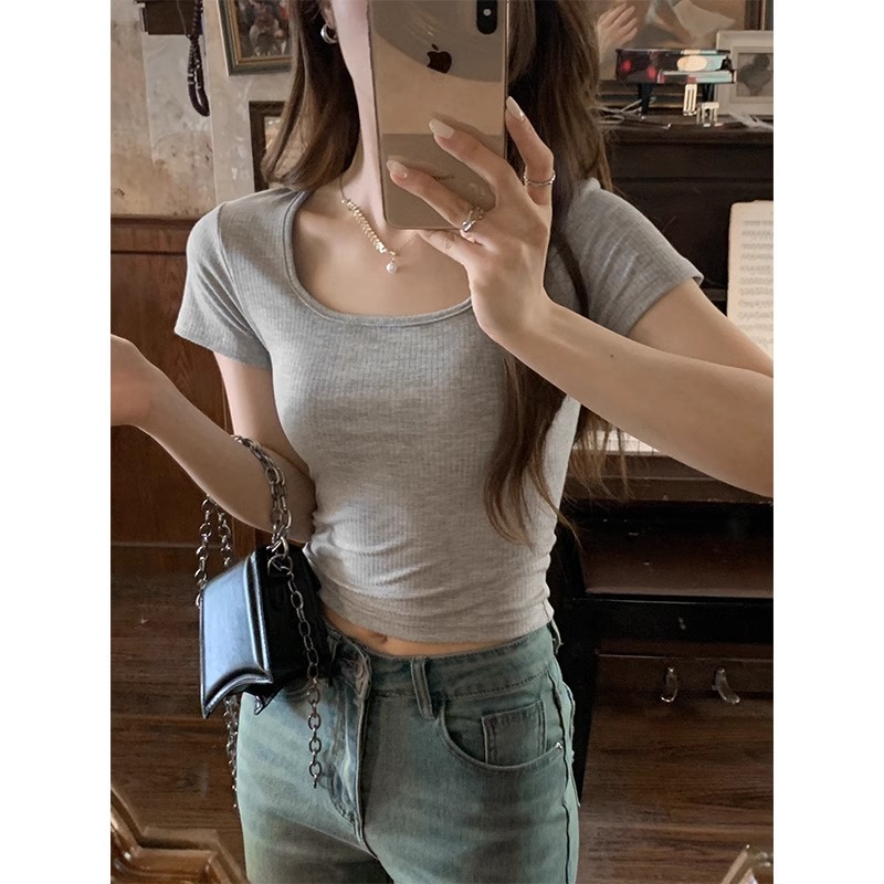 花灰色坑条方领正肩短袖t恤女春夏新款辣妹纯欲风紧身显瘦短上衣