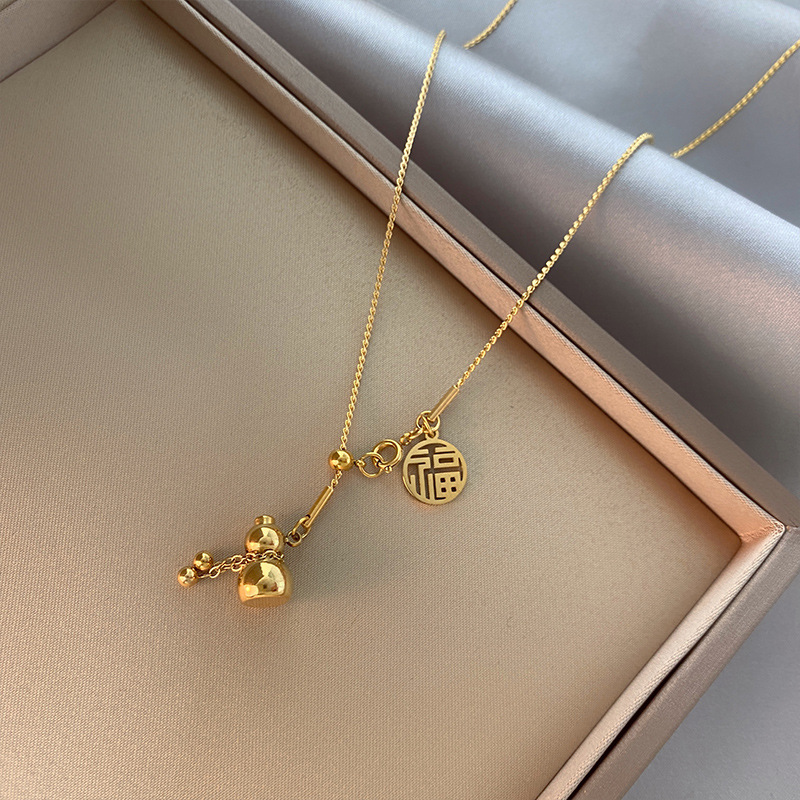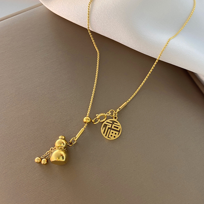 新款中国风福字抽拉葫芦福牌项链轻奢钛钢不掉色流苏锁骨链女