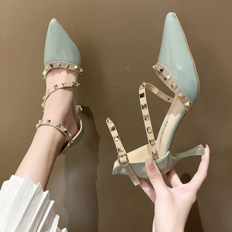 铆钉高跟鞋春夏款包头一字扣时尚网红潮鞋法式尖头细跟凉鞋女
