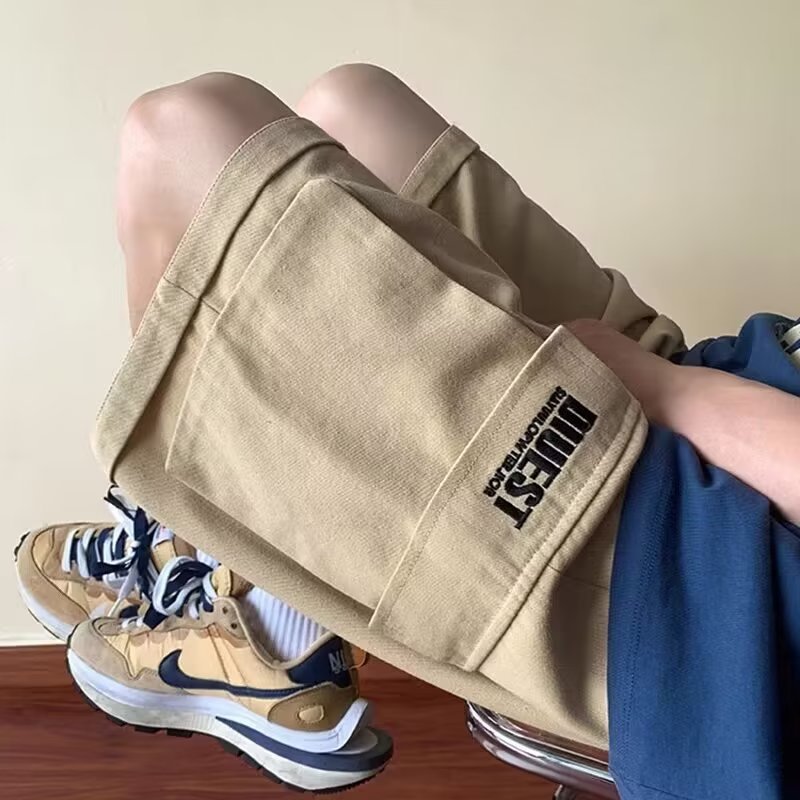 卡其色工装短裤男士夏季日系宽松休闲中裤潮牌刺绣多口袋五分裤子