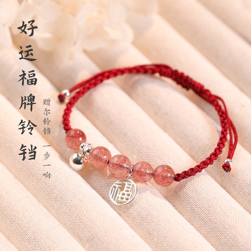 S925银福牌铃铛手工编织红绳手绳天然草莓晶水晶串珠手链闺蜜礼物