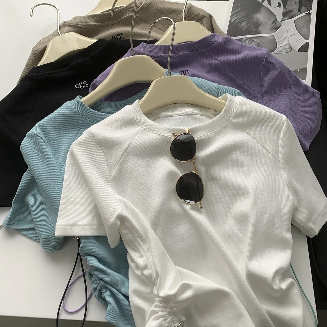腰侧抽绳短款螺纹T恤女夏季新款修身显瘦时髦百搭插肩短袖上衣潮
