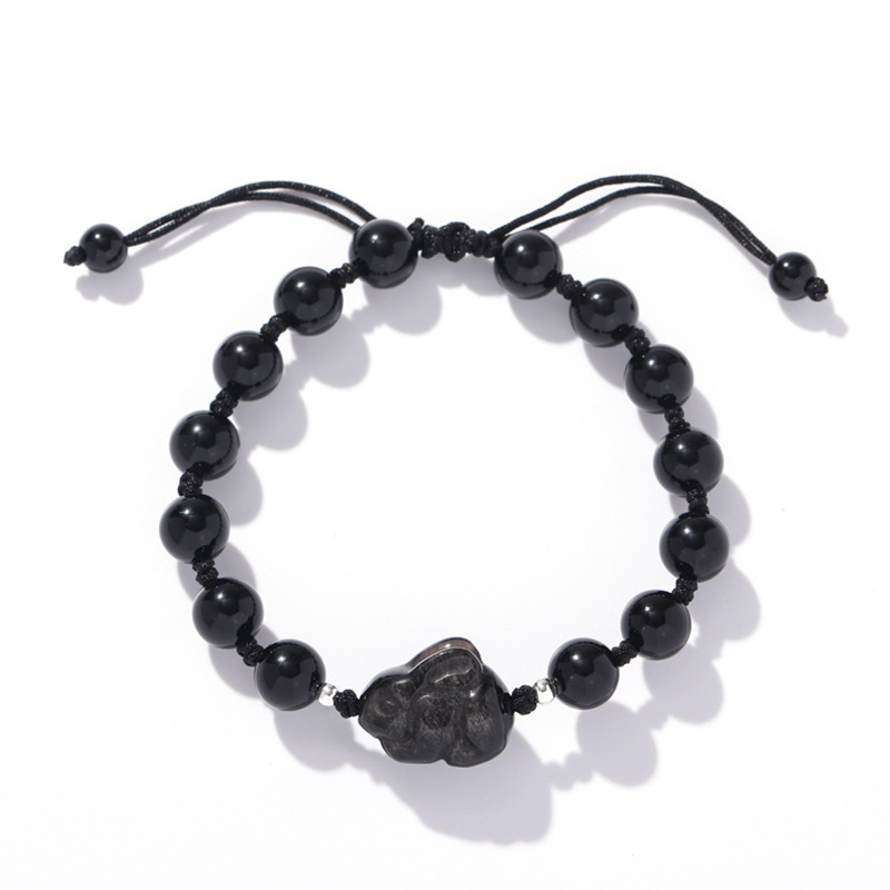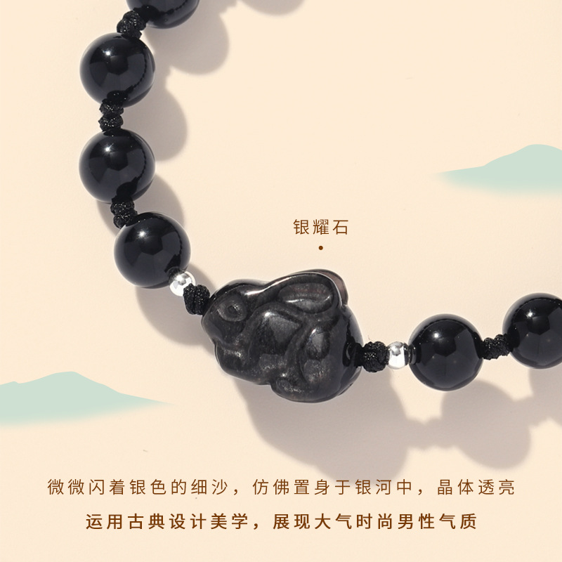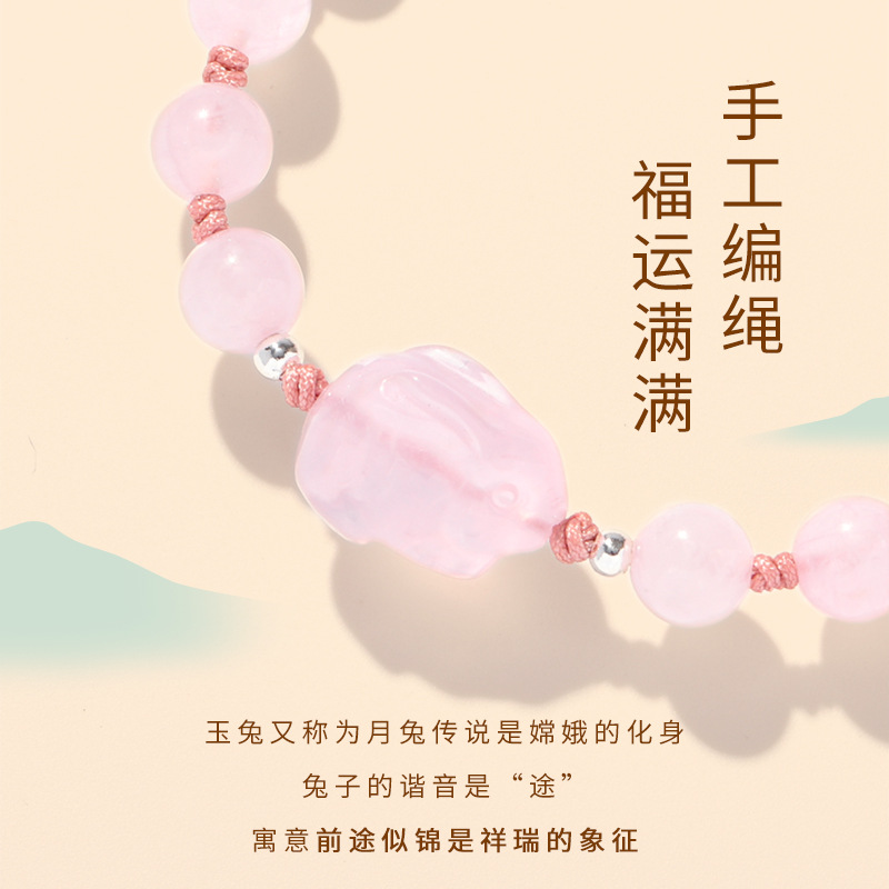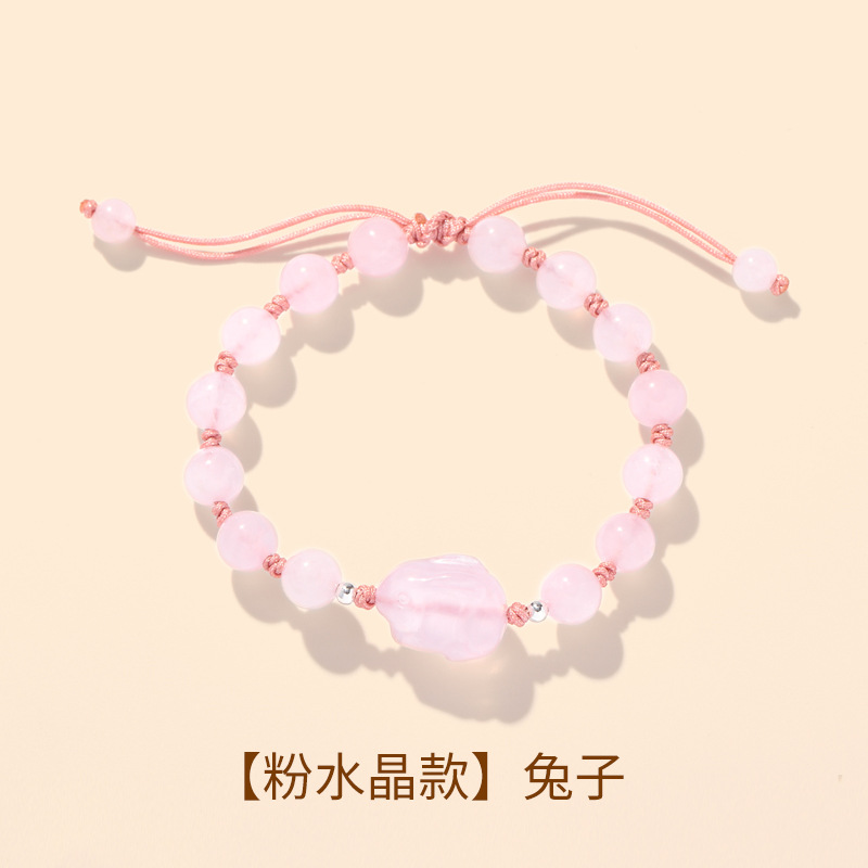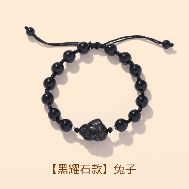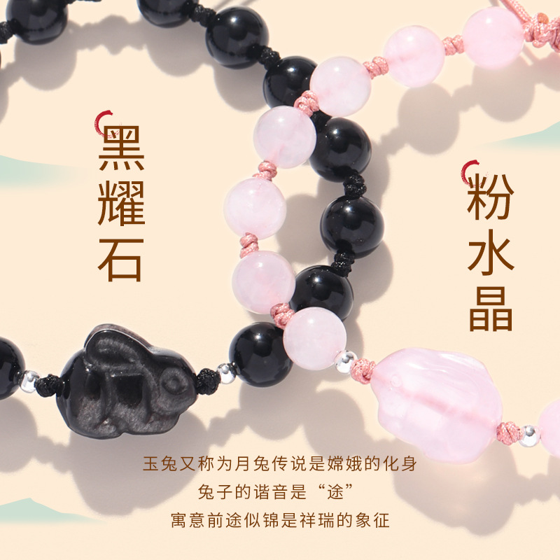 天然粉晶兔子手工编织手链女黑曜石手串本命年学生闺蜜情侣礼物