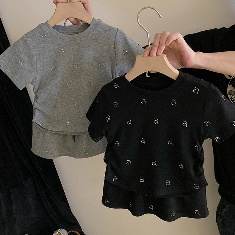 女童套装新款洋气时髦重工烫钻短袖T恤休闲舒适短裙时尚童装
