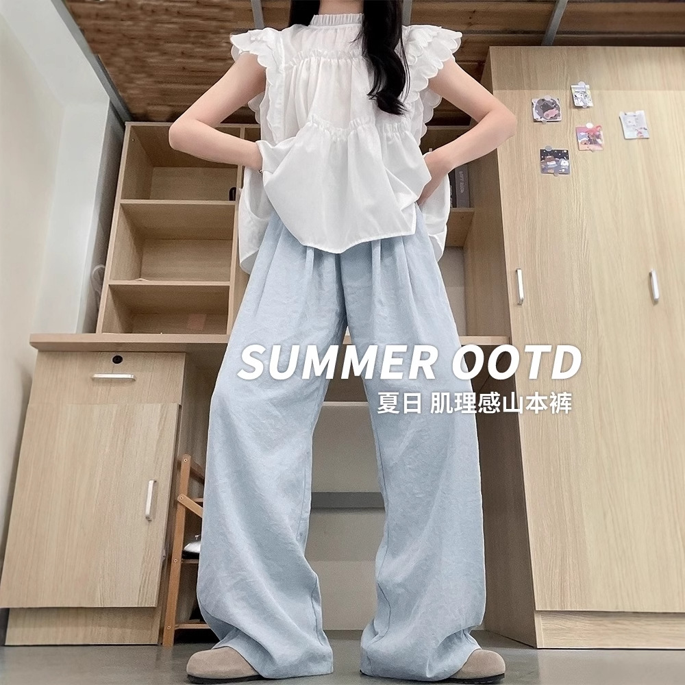 抖音质量蓝色冰丝山本裤2025夏季高腰显瘦直筒奶芙裤肌理感阔腿裤