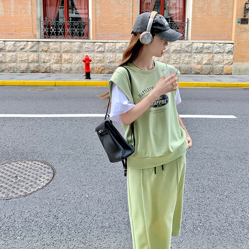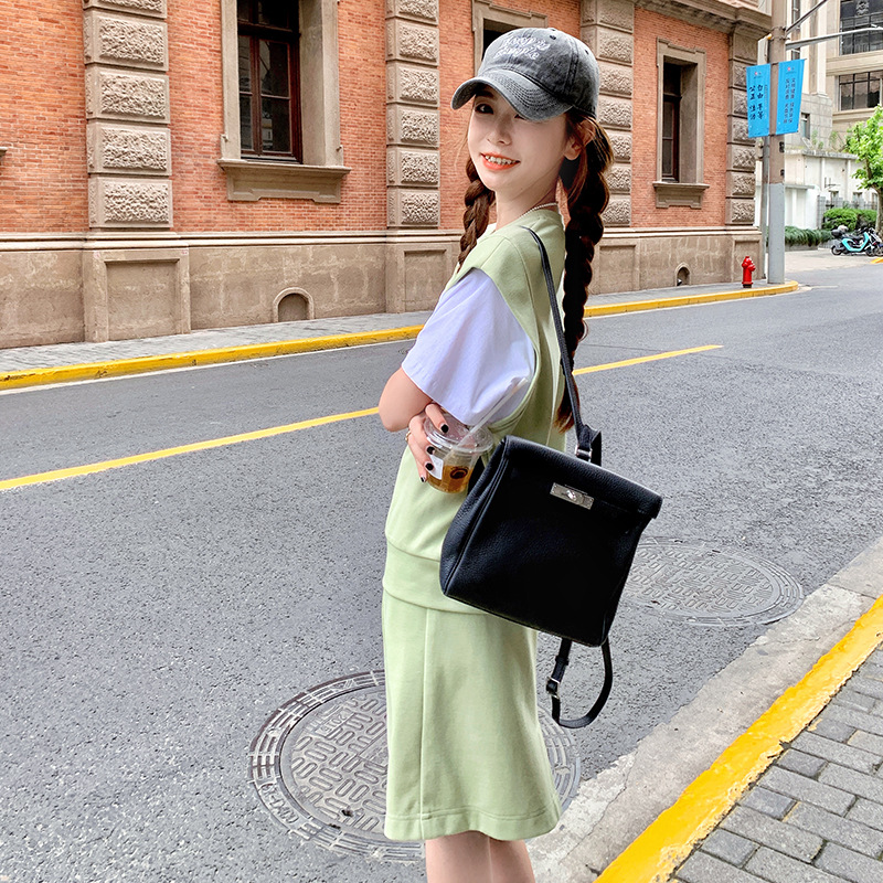 圆领女夏新款法式收腰显瘦温柔风草绿色拼色两穿长裙子