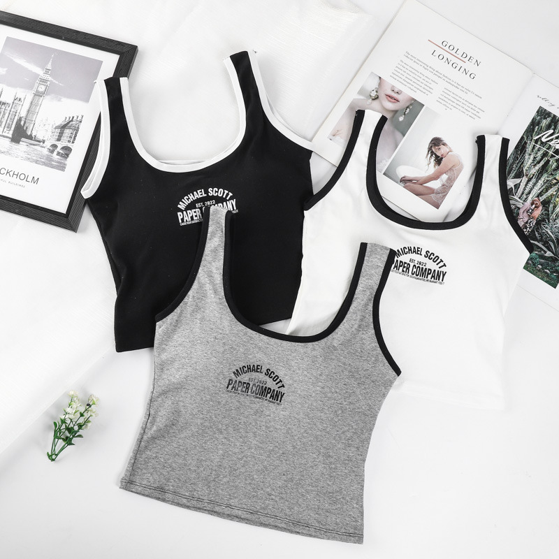 宽肩带印花字母美背吊带背心一体式固定杯内搭外穿运动内衣裹胸女