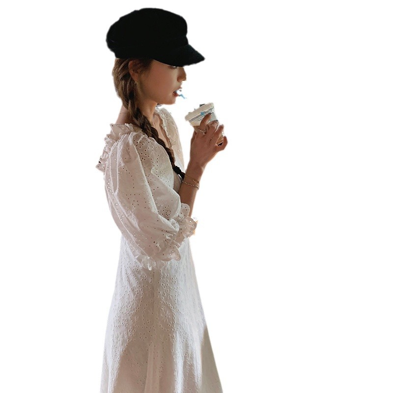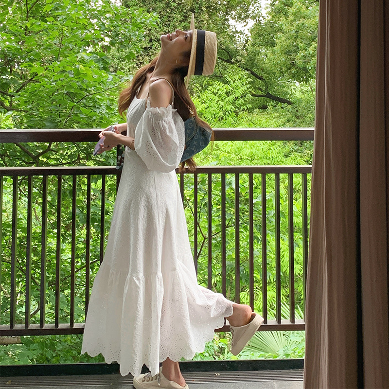 重工刺绣白色连衣裙一字肩可两穿法式温柔风年气质显瘦仙女裙