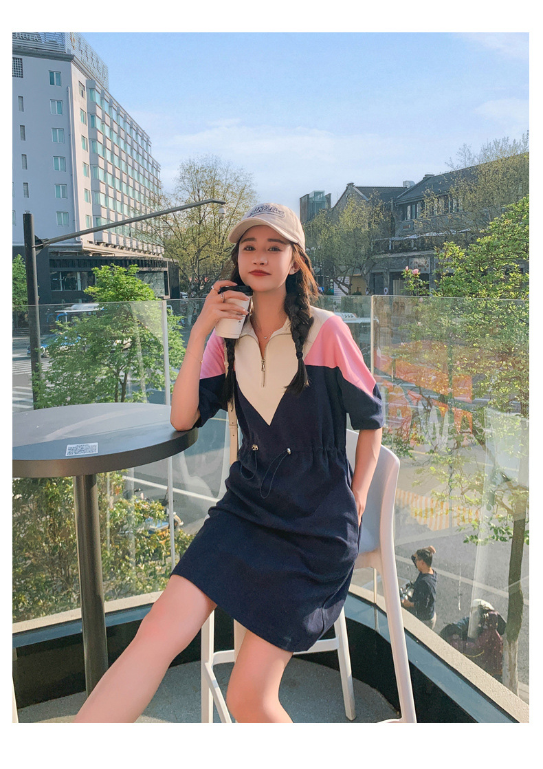 藏青色拼接撞色设计感减龄连衣裙夏装新款小个子气质连衣裙子