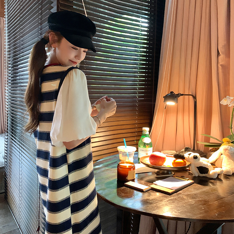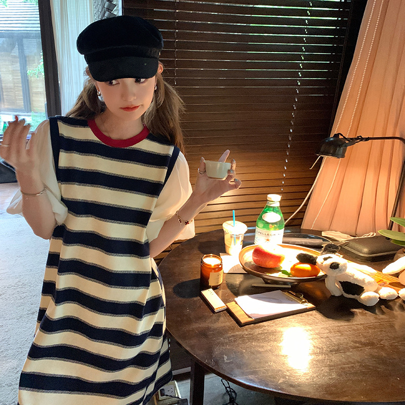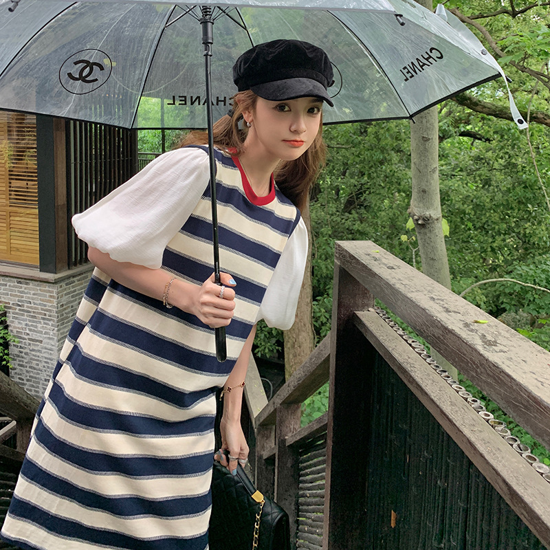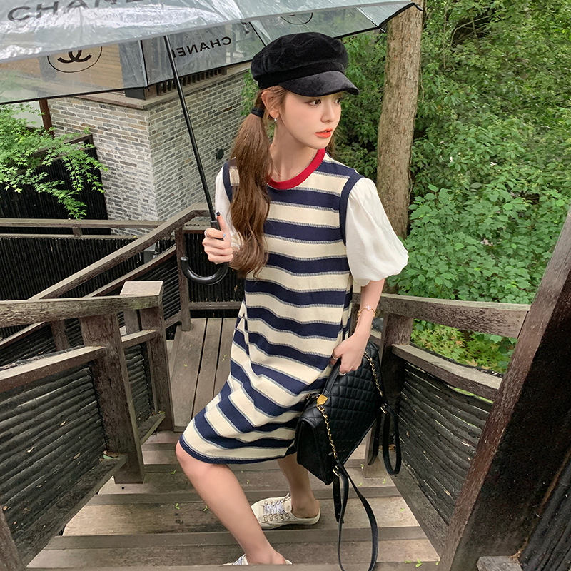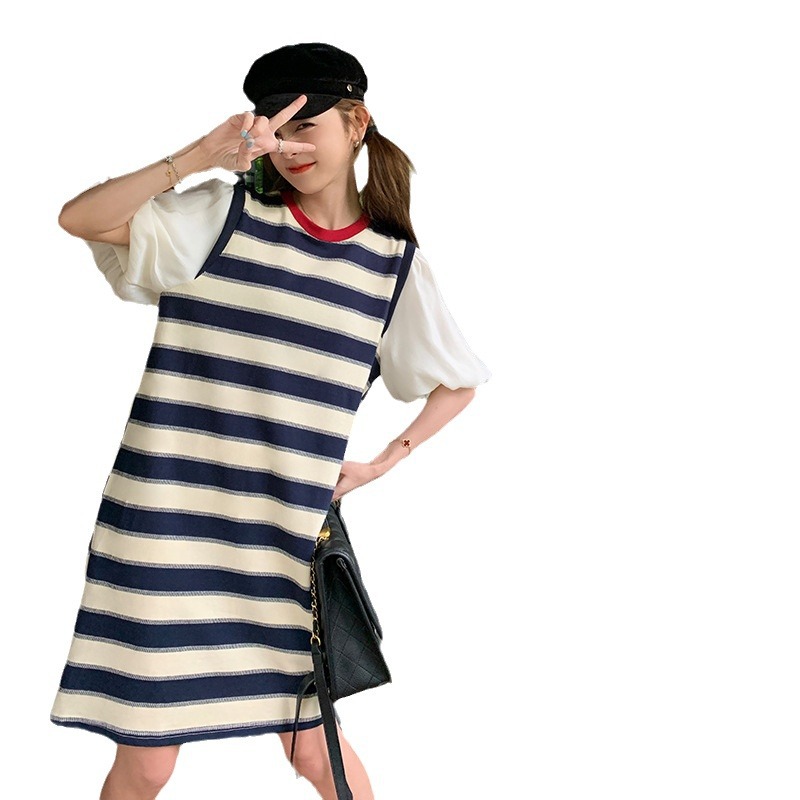 法式赫本风条纹短袖拼接连衣裙子女夏季小个子设计感收腰显瘦短裙