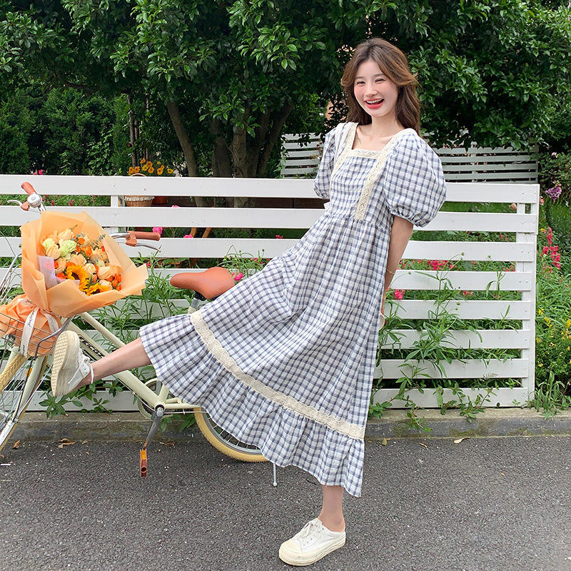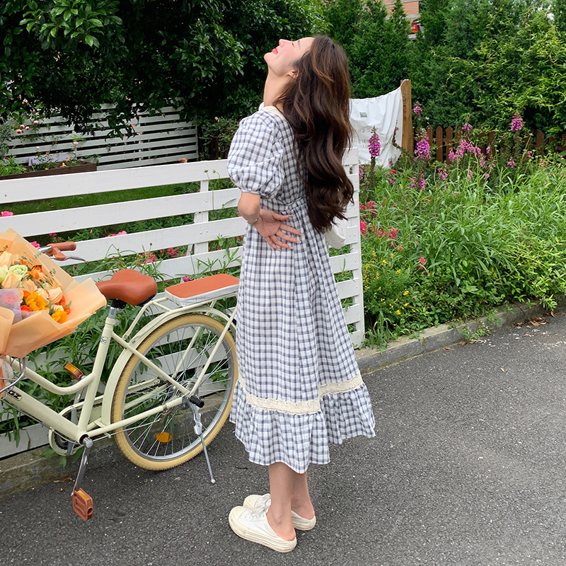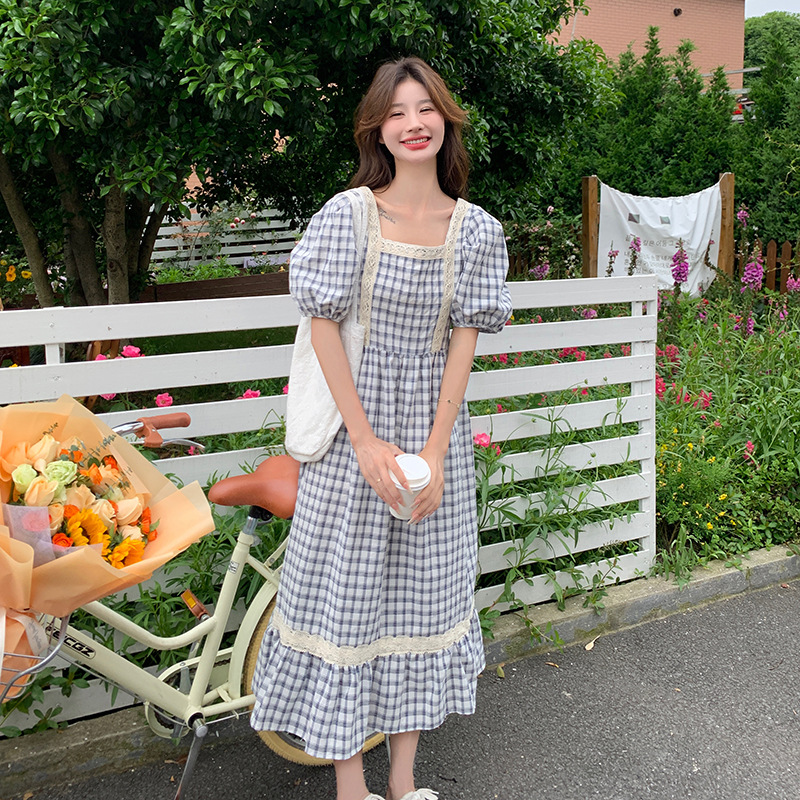 法式复古方格休闲裙蓝色格子连衣裙子女夏季新款小个子法式