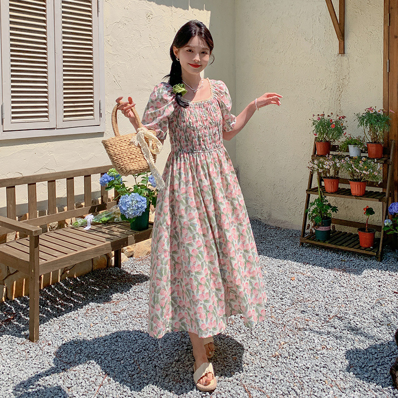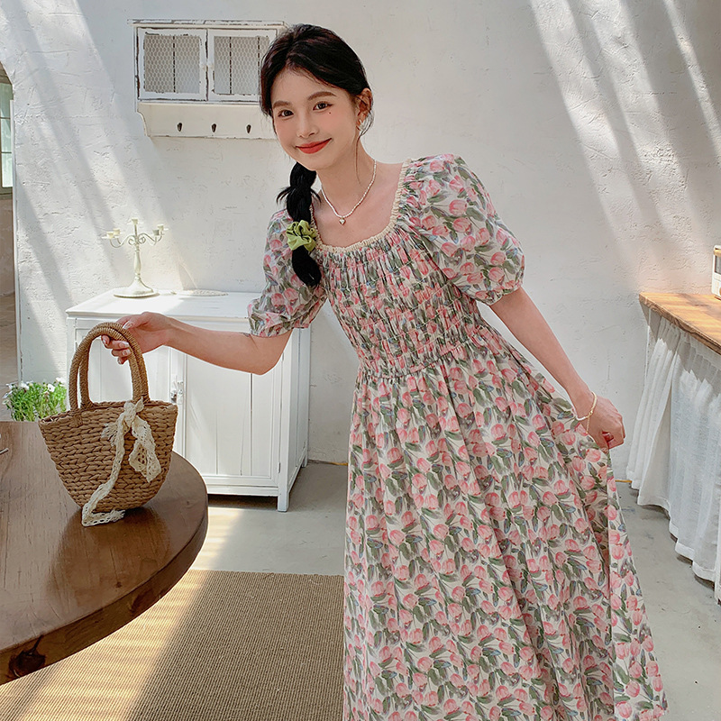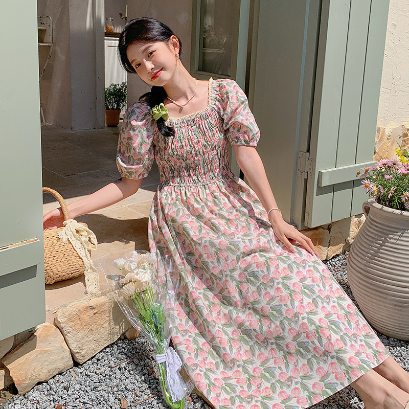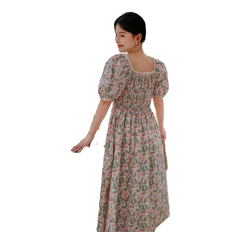 郁金香油画感法式方领泡泡袖夏季收腰显瘦减龄韩版连衣裙女