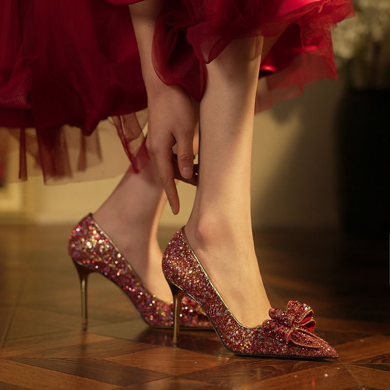 婚鞋女新款红色水晶亮片高跟细跟蝴蝶结尖头大码宴会礼服鞋