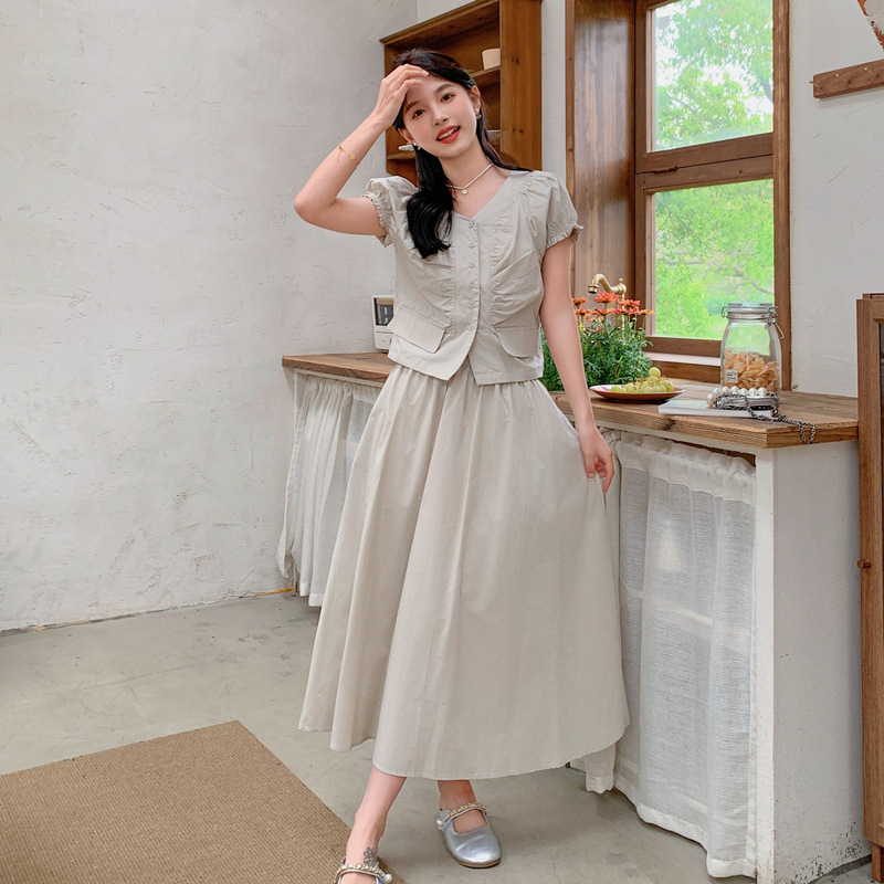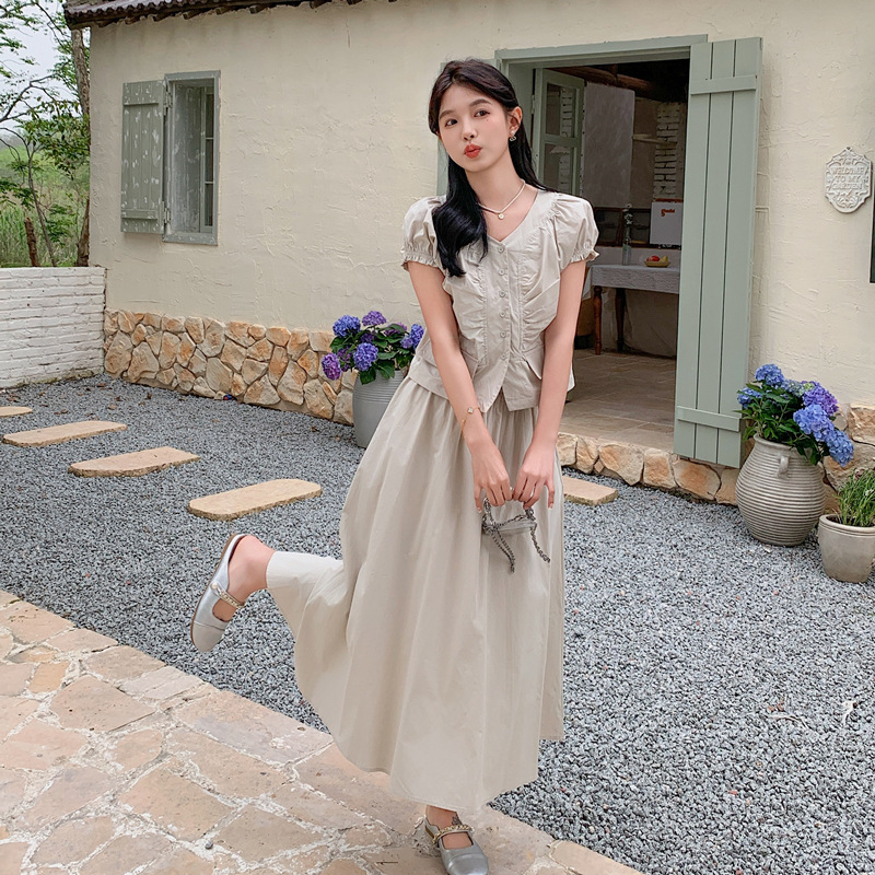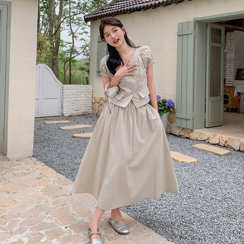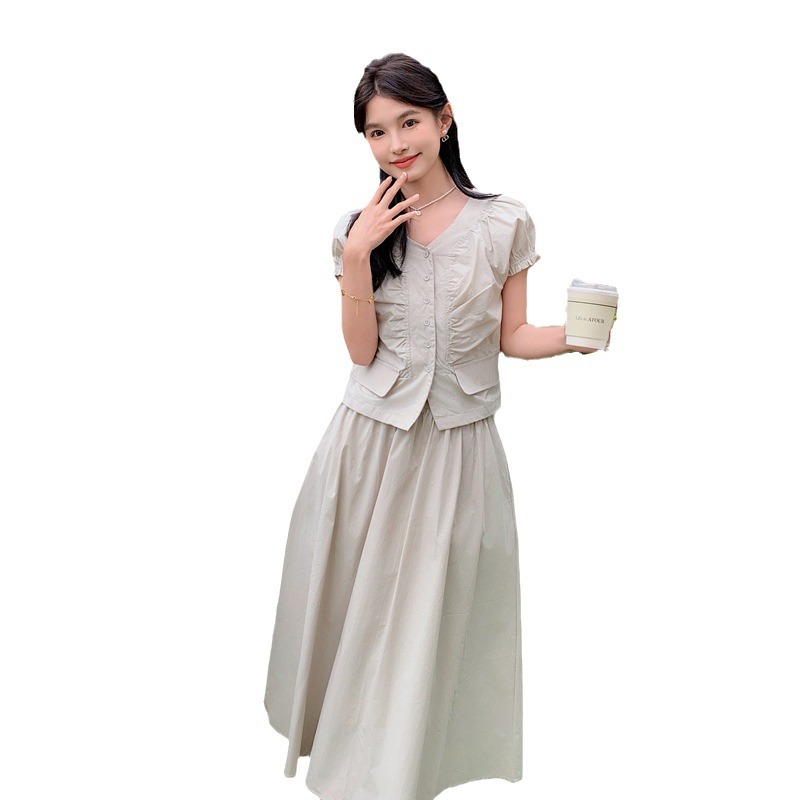 浅卡其显高显瘦两件套上衣半身裙韩版褶皱连衣裙夏季法式温柔甜美