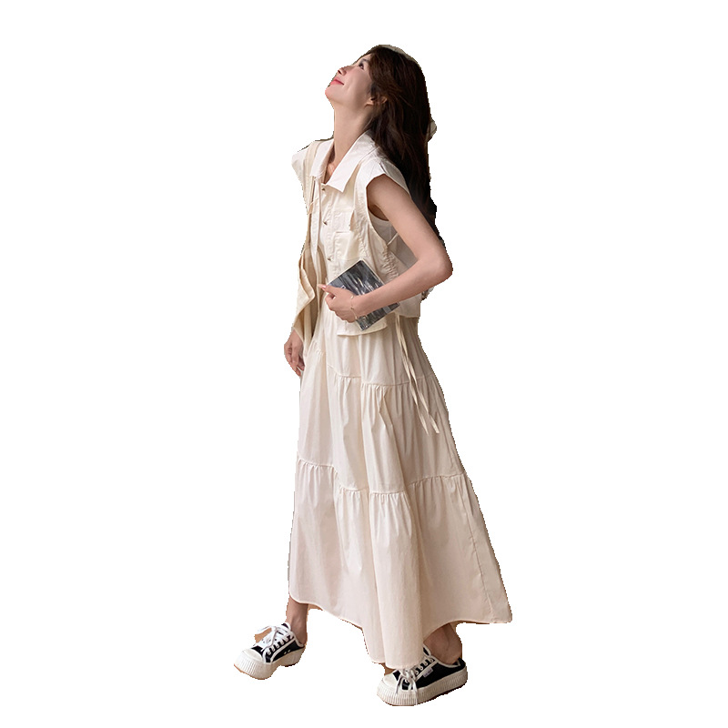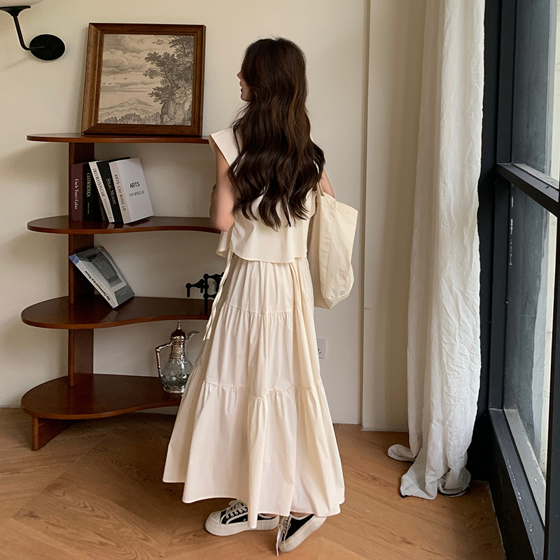 全新款工装大摆长裙两件套法式白色领女装夏季新款小个子套装