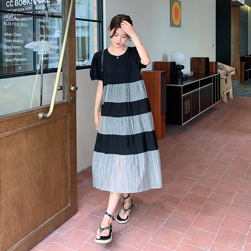 拼色设计感小众条纹连衣裙女年夏季新款气质褶皱拼接休闲裙