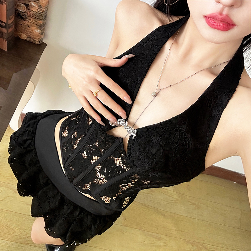 跨境欧美风新款女装性感露背挂脖蕾丝镂空背心收腰半身裙