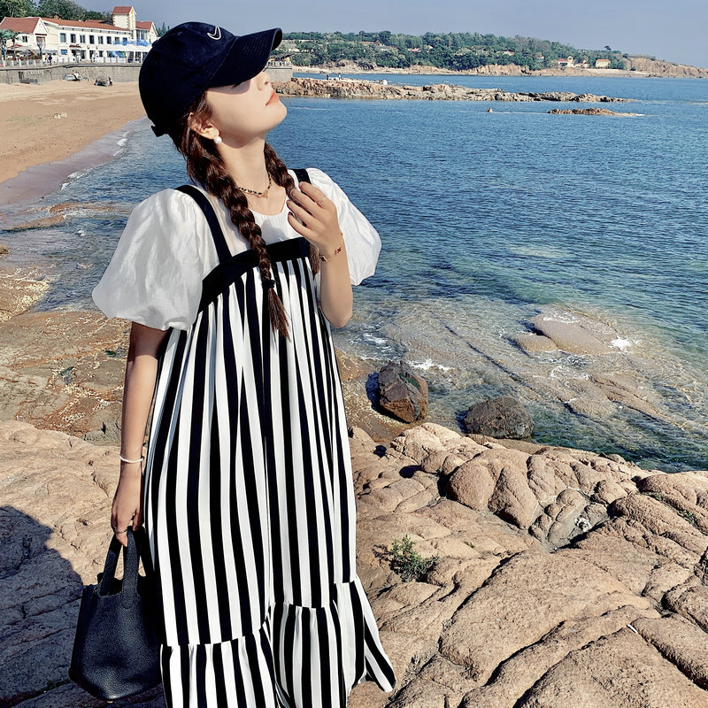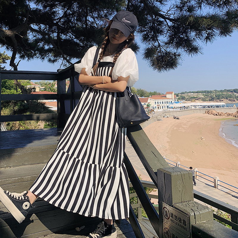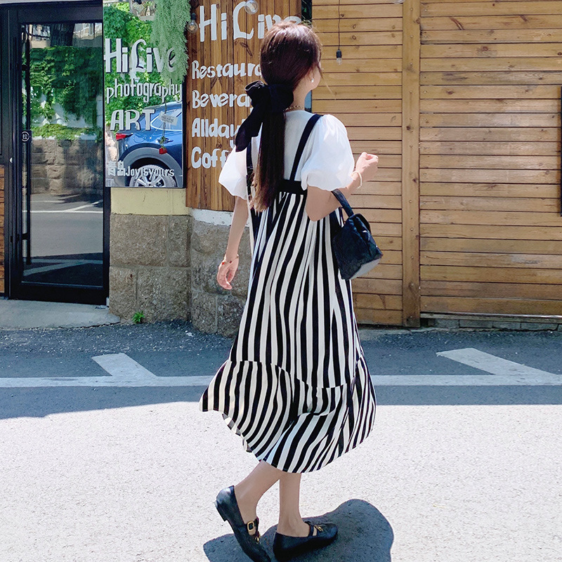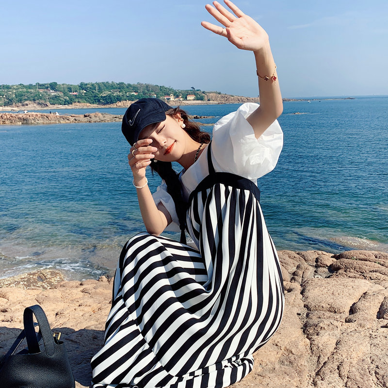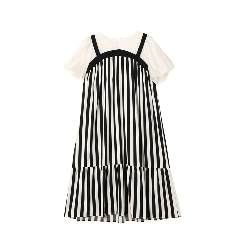 法式连衣裙新款女夏好看气质裙子小个子设计感竖条拼接连衣裙