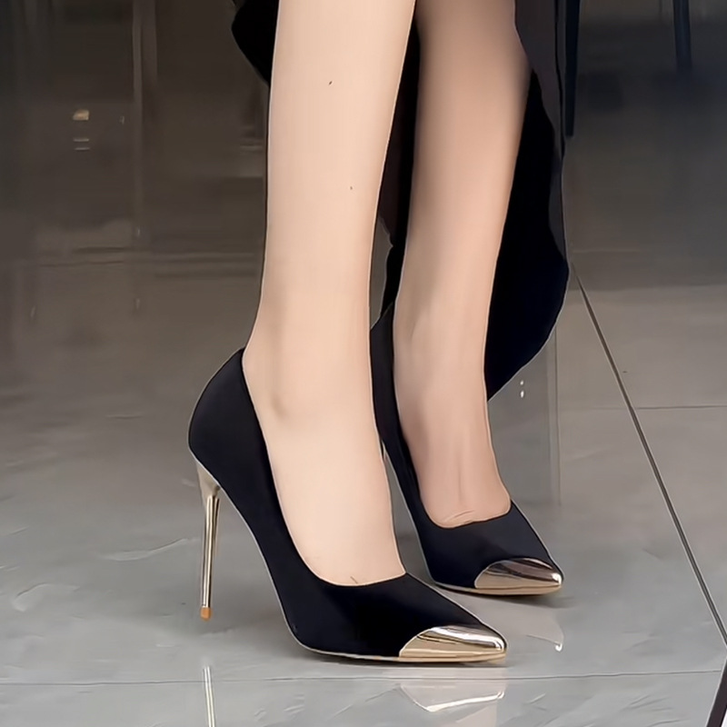 黑色高跟鞋女春秋新款金属尖头细跟浅口绒面法式气质性感单鞋
