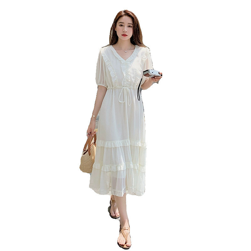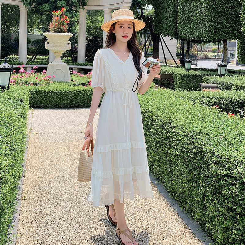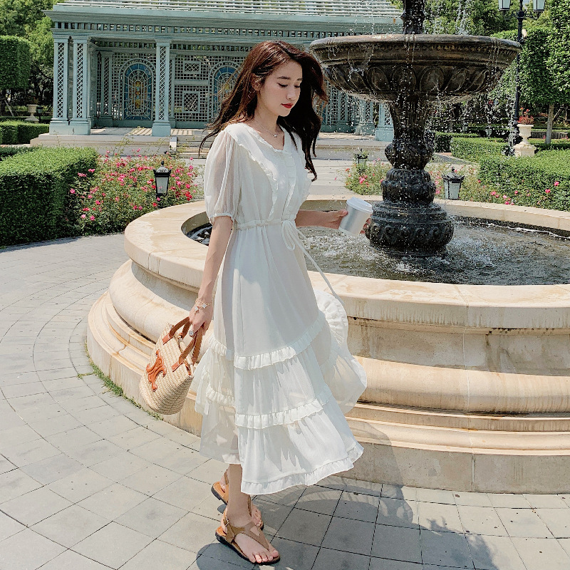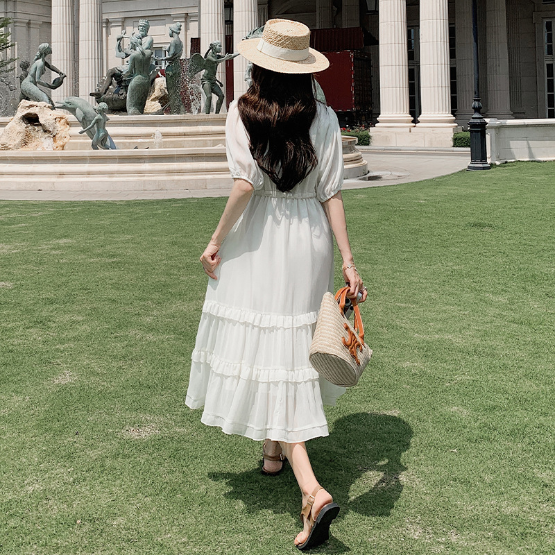 法式甜美收口袖连衣裙女夏收腰初恋小白裙度假风木耳边休闲袖长裙