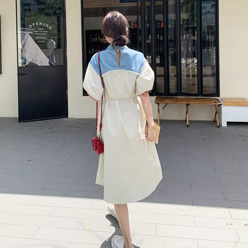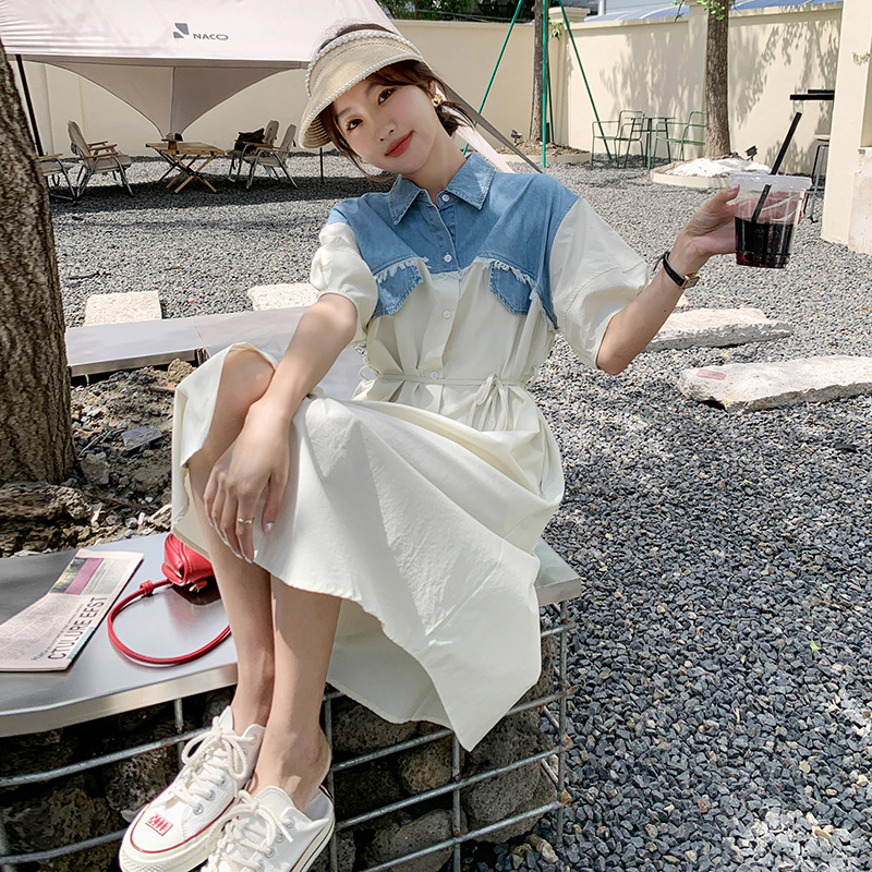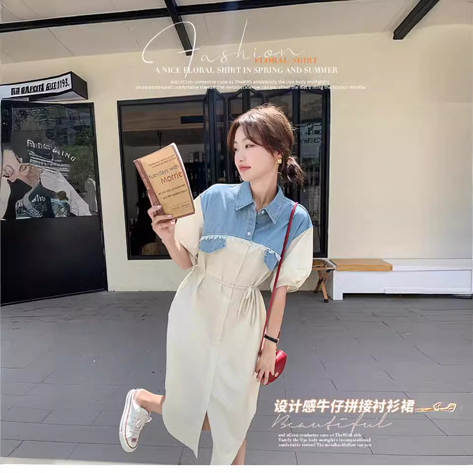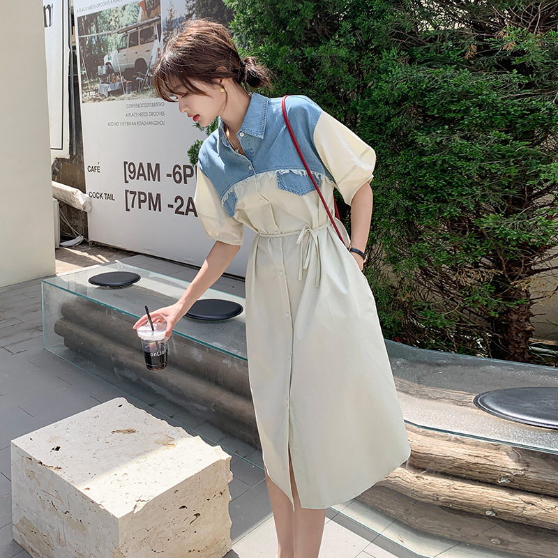 小香风气质通勤显瘦假两件衬衫式连衣裙女夏季薄款牛仔拼接衬衫裙