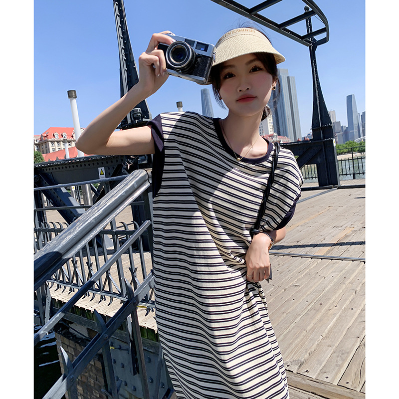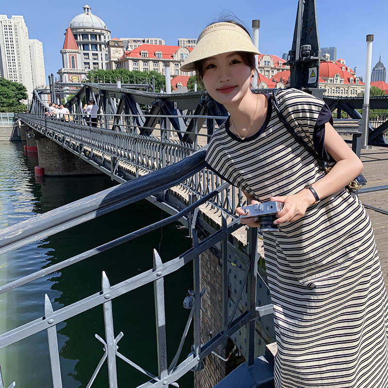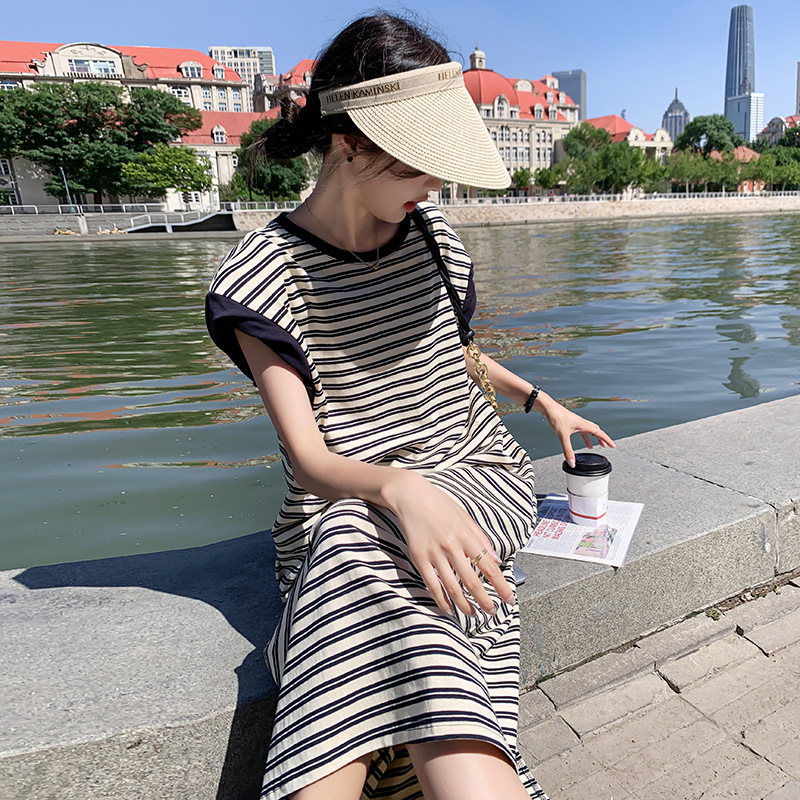 圆领短袖连衣裙女夏季垂感中长款百搭A字细条纹连衣裙鸡显瘦长裙
