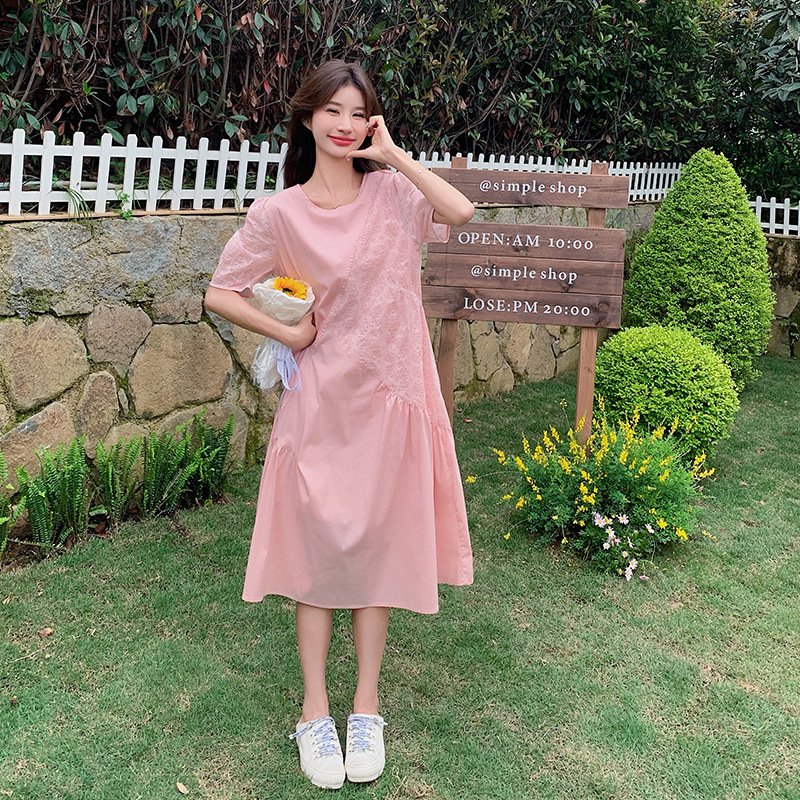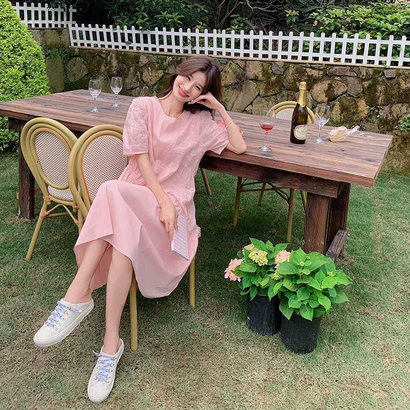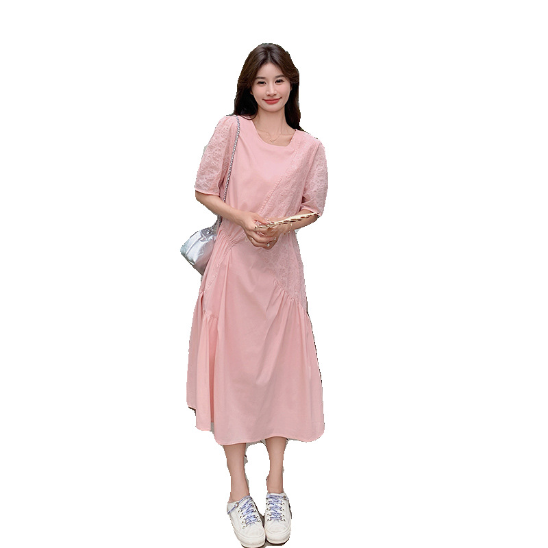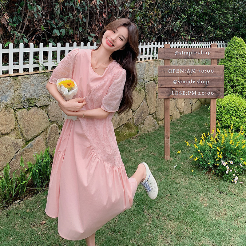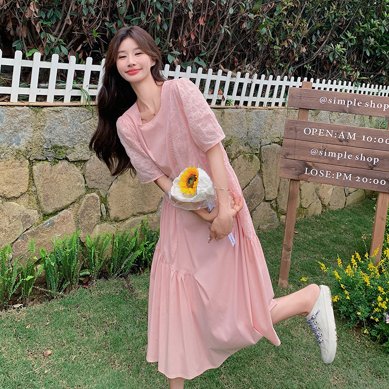 纯欲风温柔甜美泡泡袖粉色短袖针织连衣裙女装芭蕾裙子修身短裙