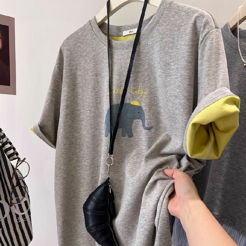 新款美式复古慵懒风撞色大象字母刺绣宽松显瘦短袖t恤撞色边上衣