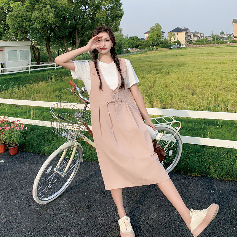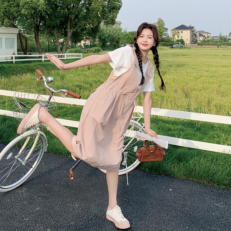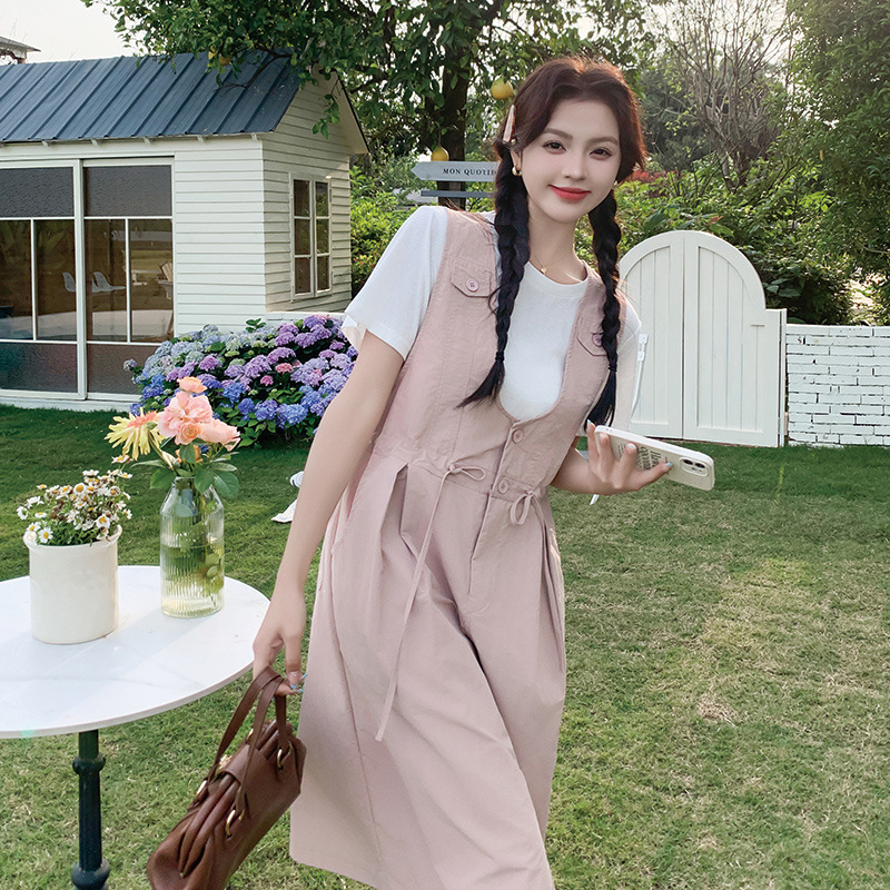 粉色背带两件套小个子赫本风连衣裙女夏季新款法式茶歇收腰辣