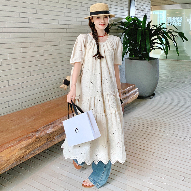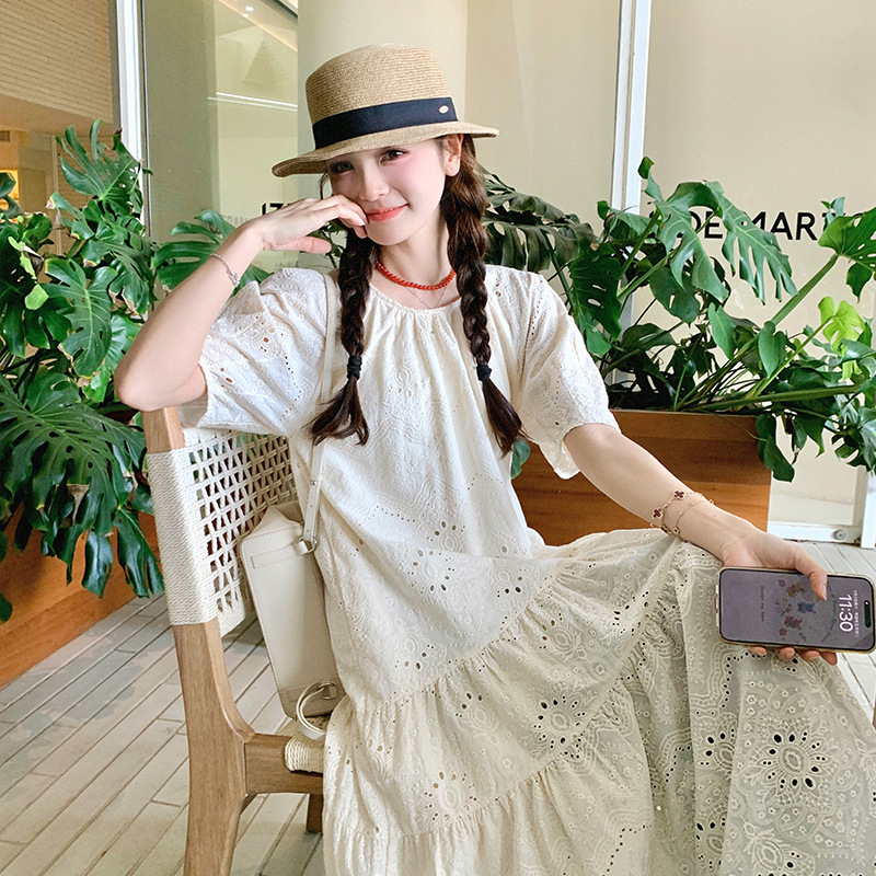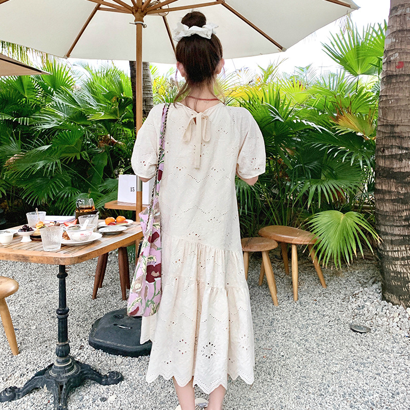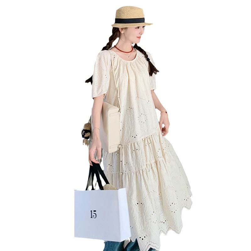 米白色连衣裙女夏季新款休闲法式公主风小个子收腰显瘦镂空裙