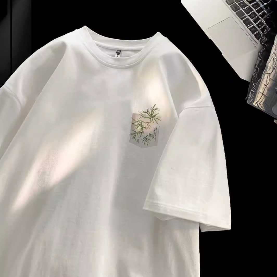 新中式竹子印花短袖t恤男夏季新款潮牌宽松重磅半袖青少年体恤衫