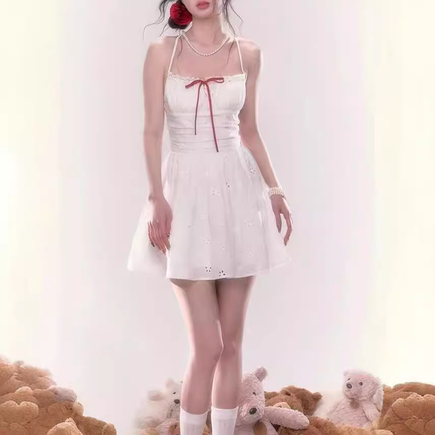 法式假日蕾丝绣花纯欲蝴蝶结露背吊带连衣裙女