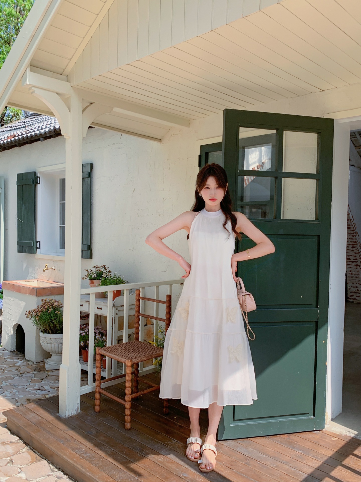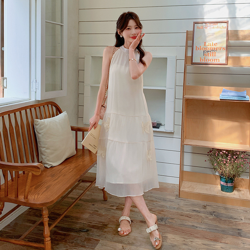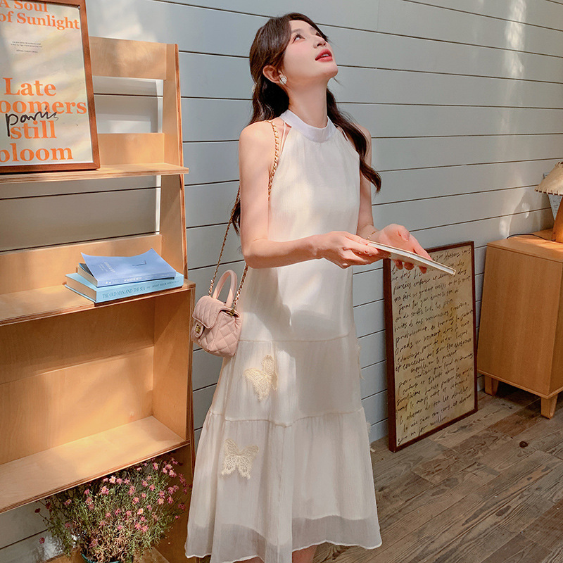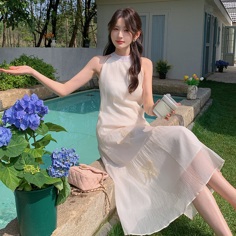 夏季气质无袖长款挂脖式蝴蝶饰品法式印花吊带连衣裙女复古气质