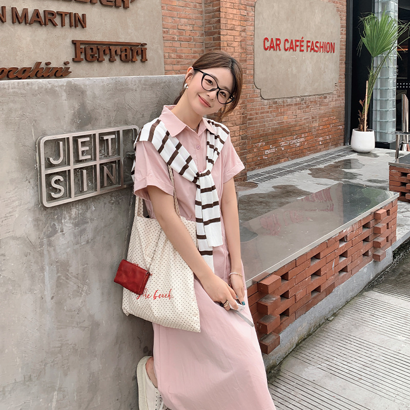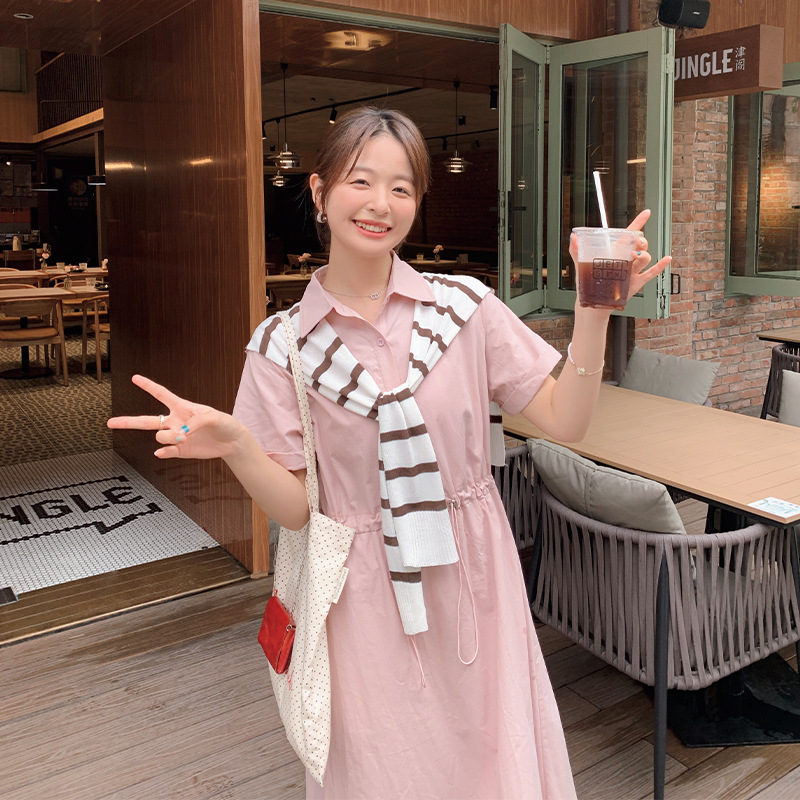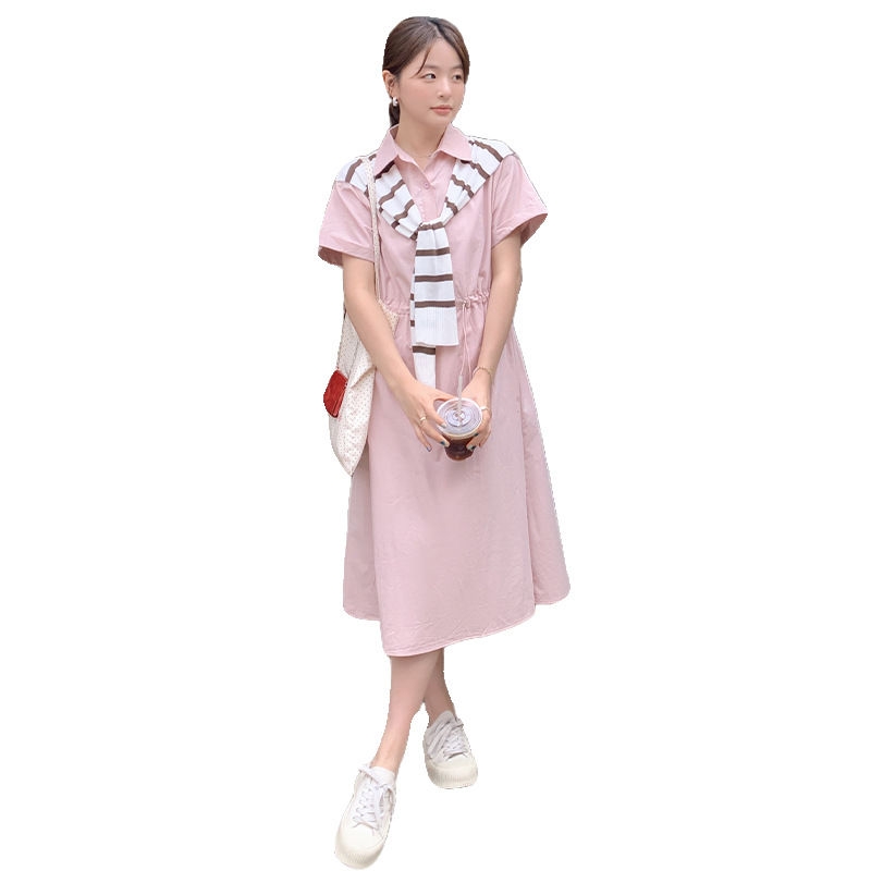 粉色披肩连衣裙女年春夏季新款polo领收腰显瘦气质短袖赫本风