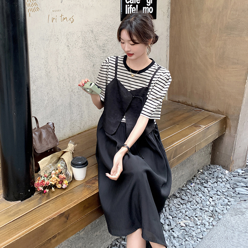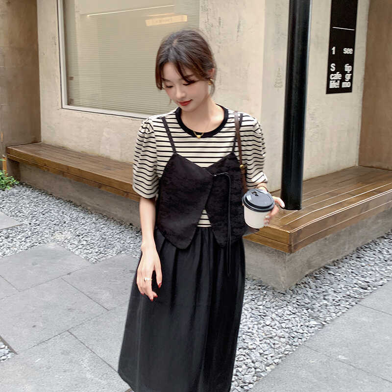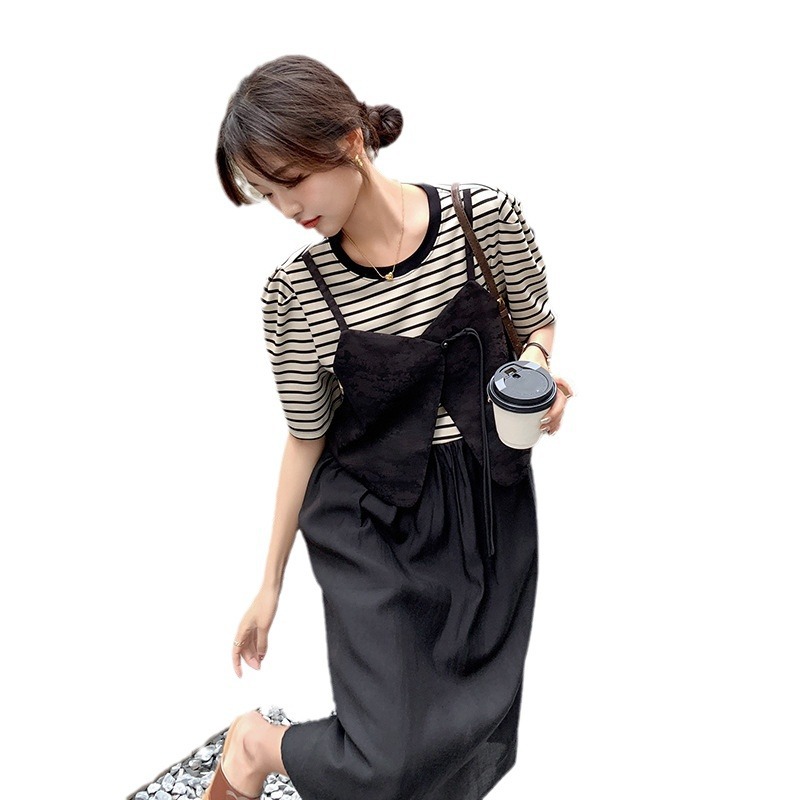 条纹拼接新中式T恤连衣裙女夏季新款休闲宽松休闲直筒裙子