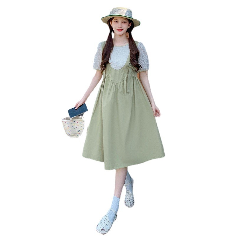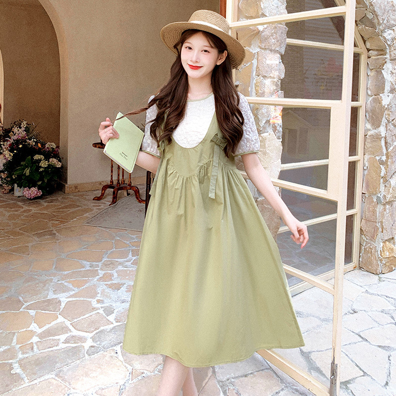 圆领连衣裙女夏新款法式收腰显瘦温柔风草绿色休闲长裙子