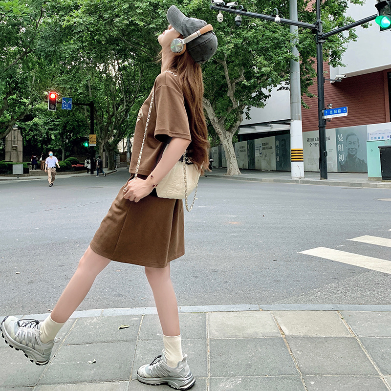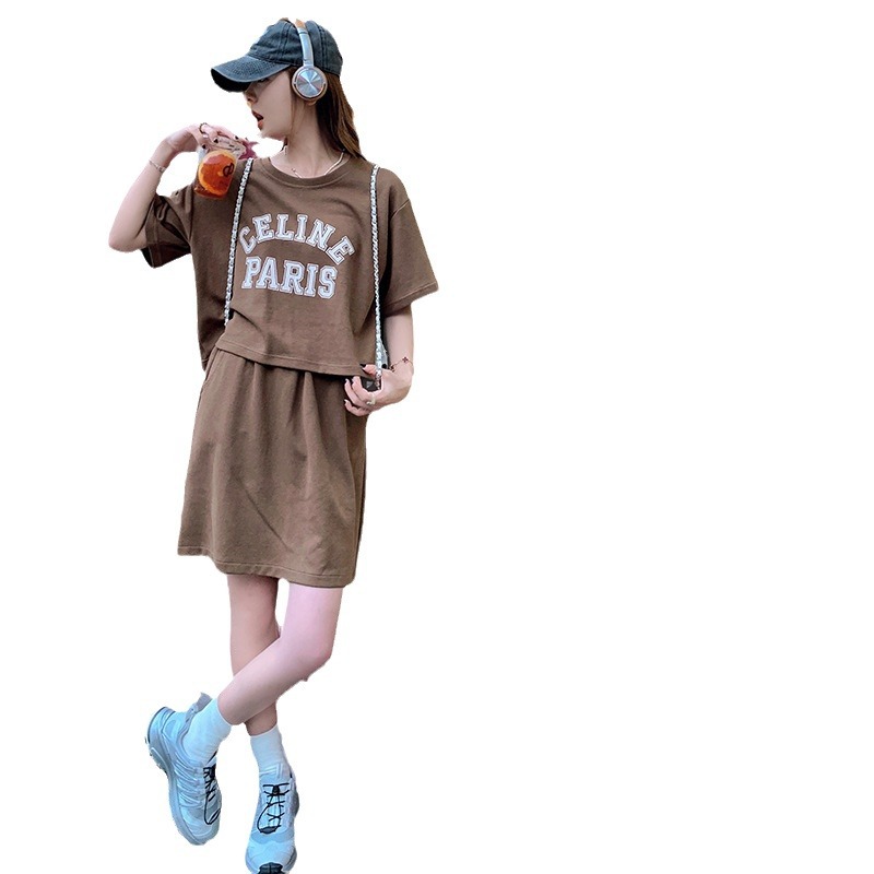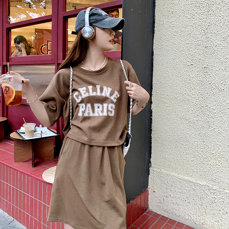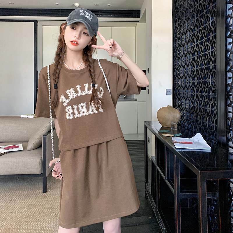 针织套装裙赫本风女夏新款收腰修身显瘦圆领短袖字母图案