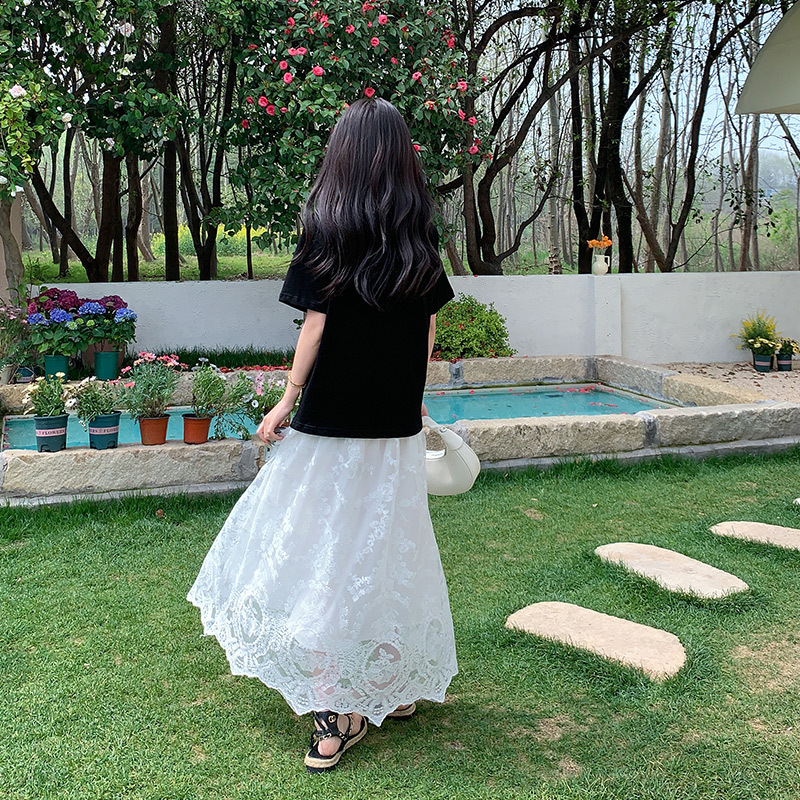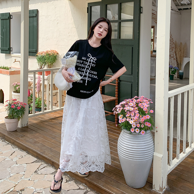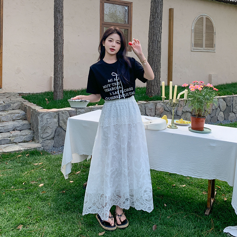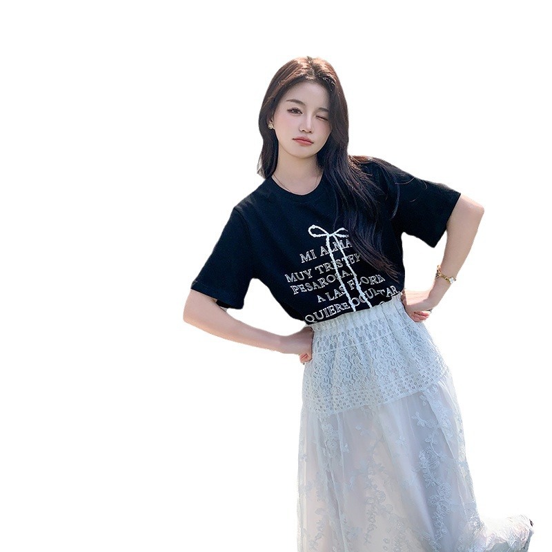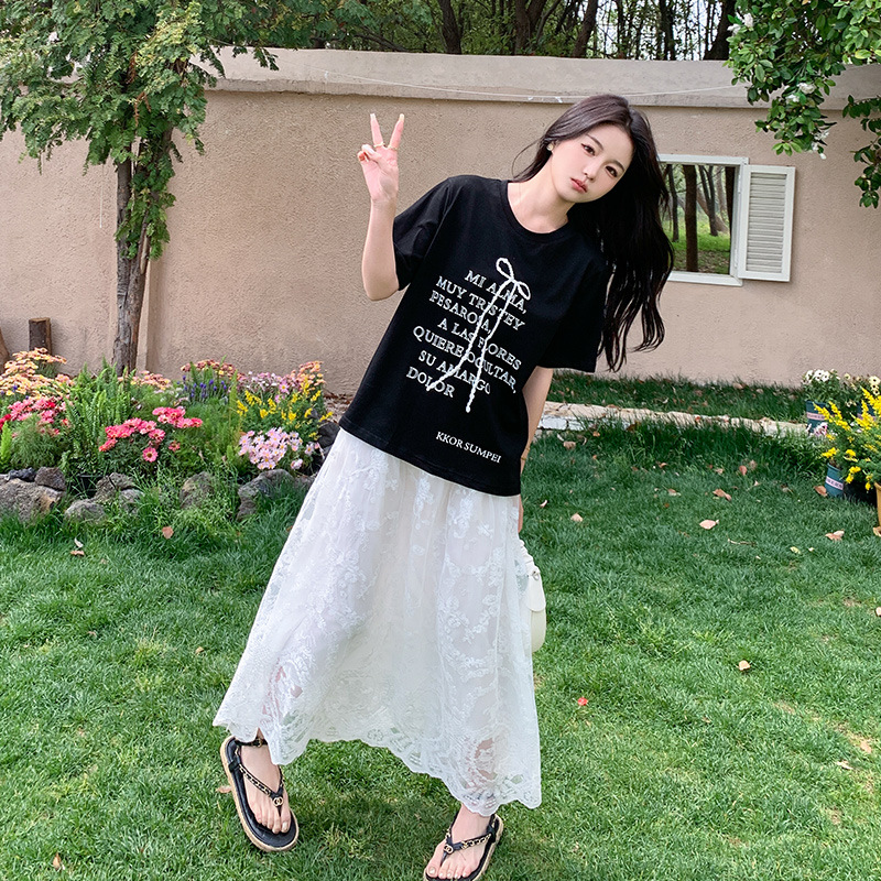 黑T白裙套装灰色短袖T恤女夏季休闲设计感褶皱收腰显瘦长裙子