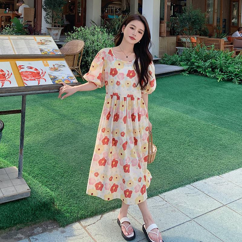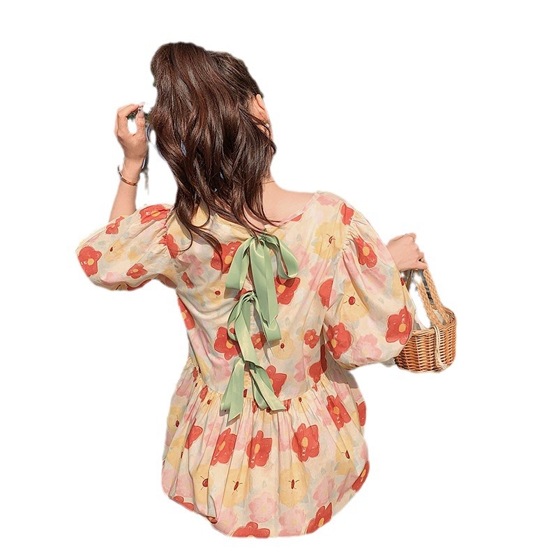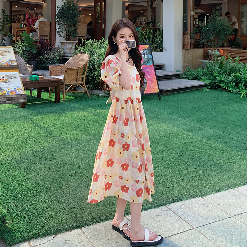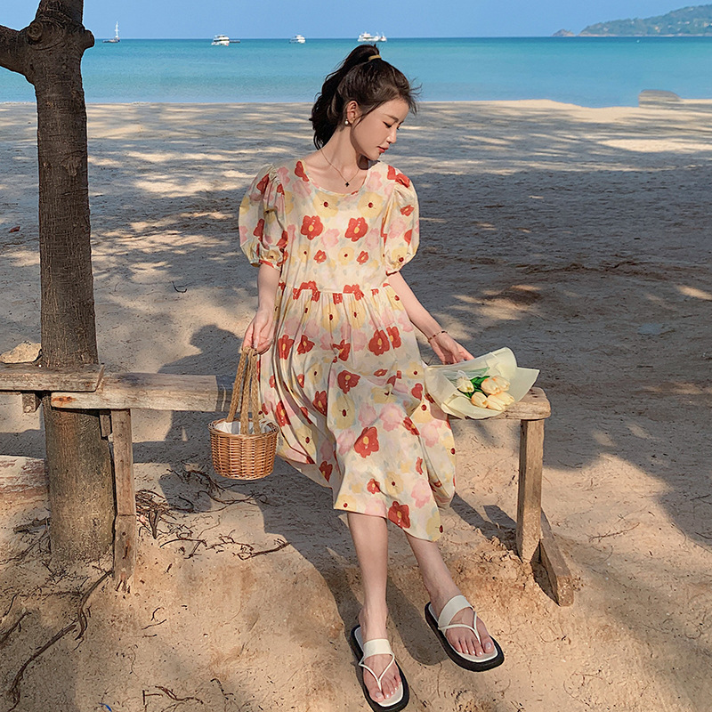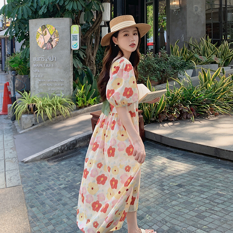 法式设计感小众花色短袖碎花连衣裙女春季绝美显瘦印花度假长裙子