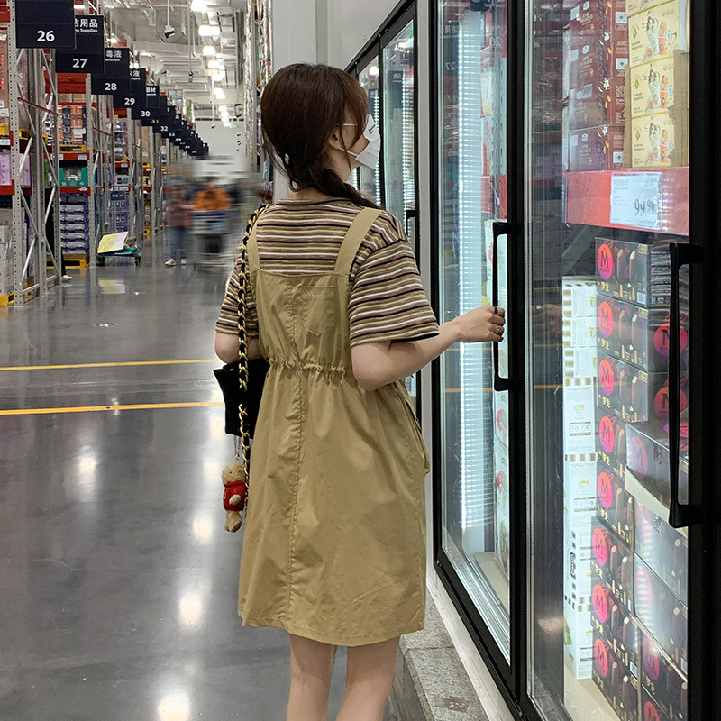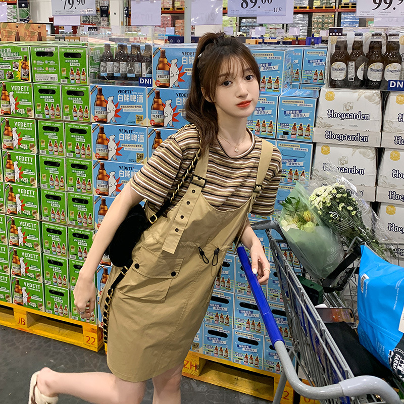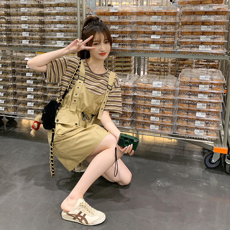 条纹T恤工装背带裙套装法式女春秋新款日系学院风小清新休闲