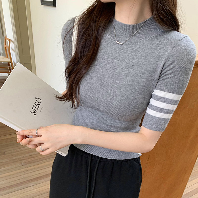 折扣灰色拼接修身短袖羊毛针织衫女秋品牌新款气质学院短上衣