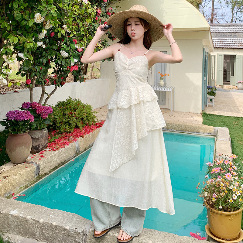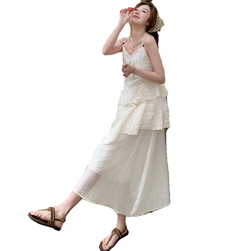 海边度假白色无袖吊带连衣裙子女夏季新款法式收腰长裙