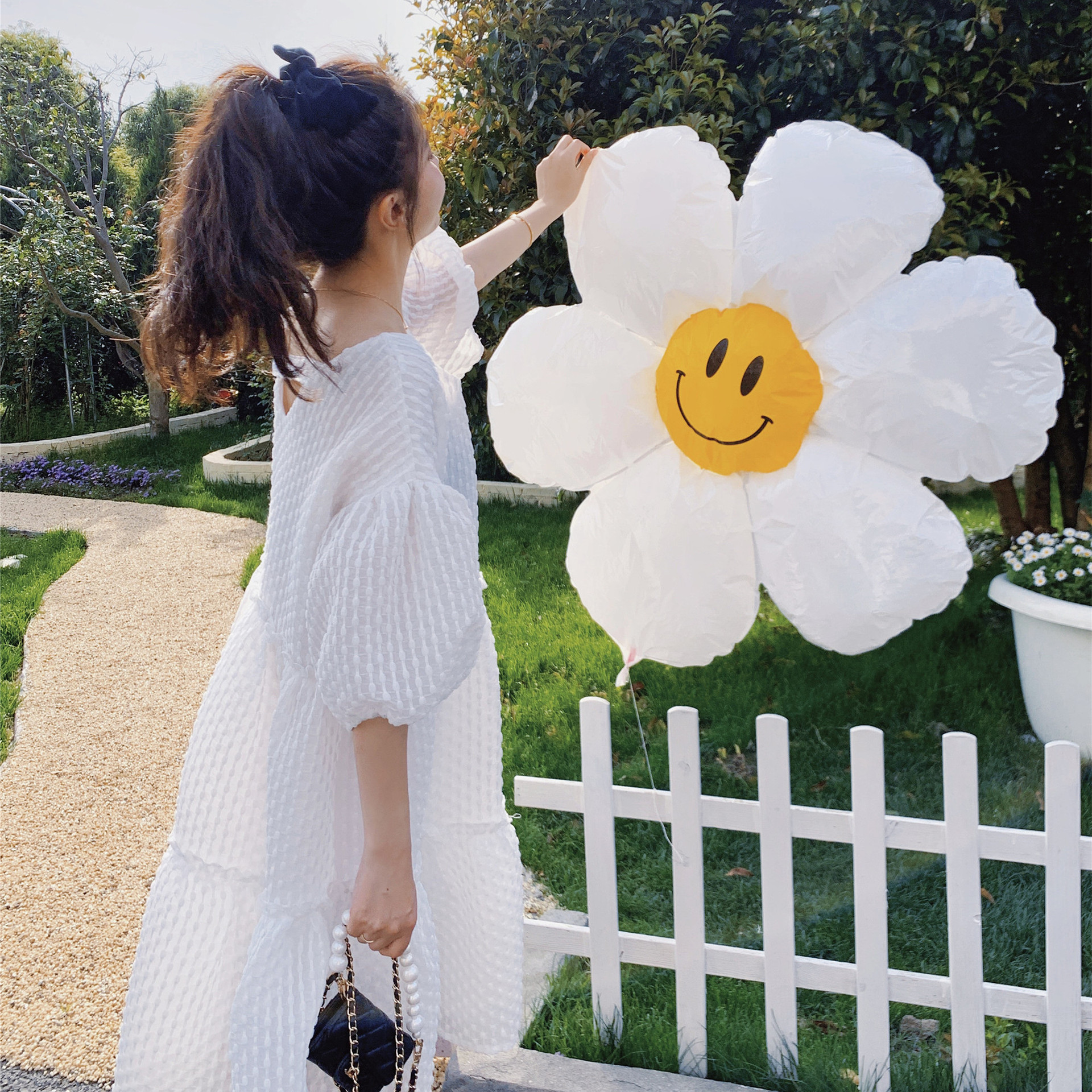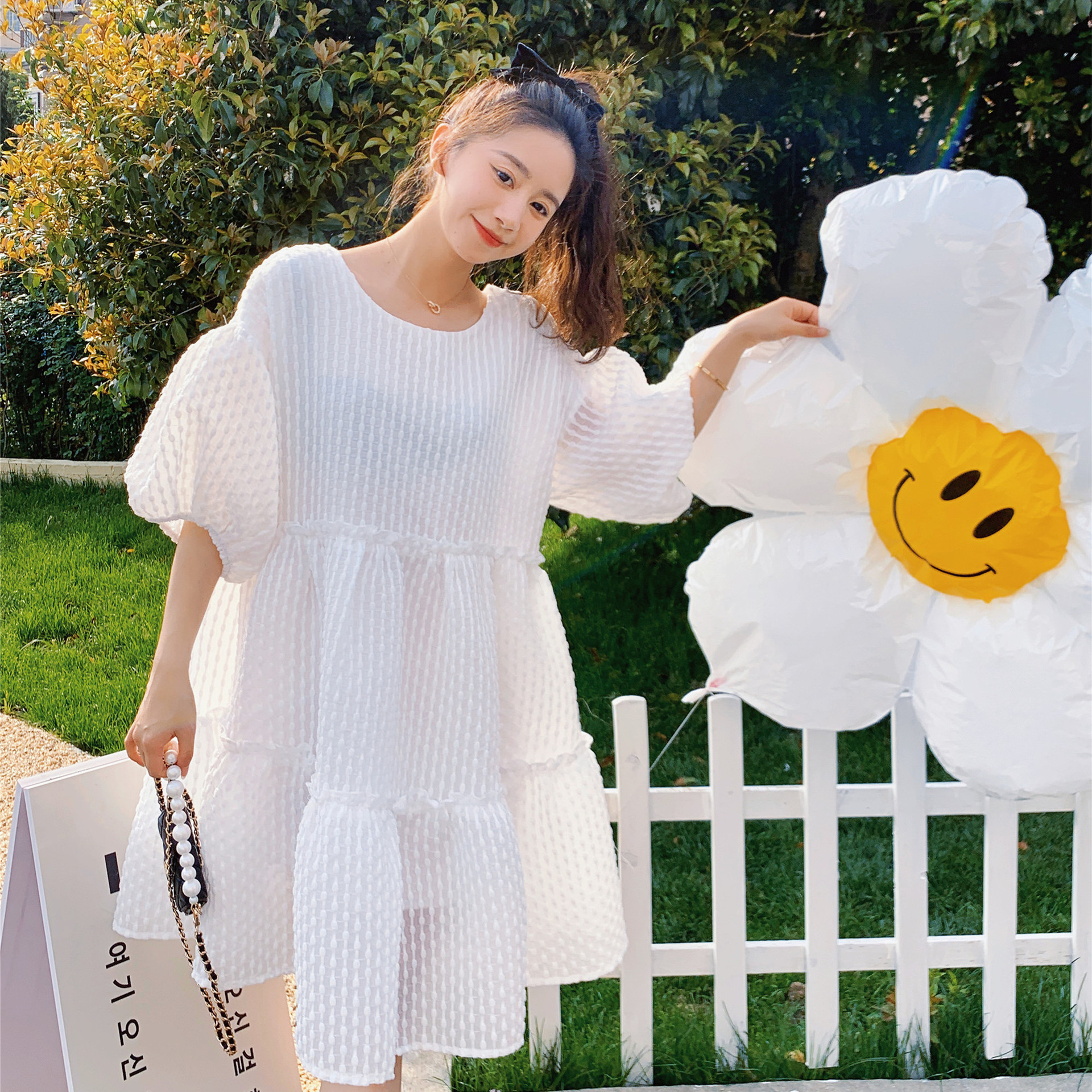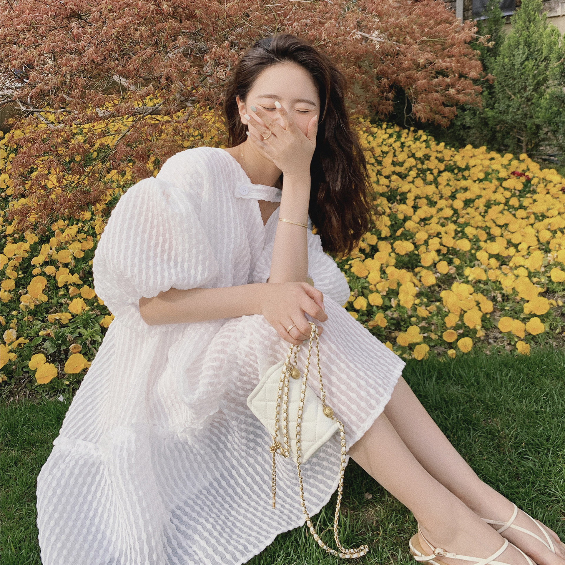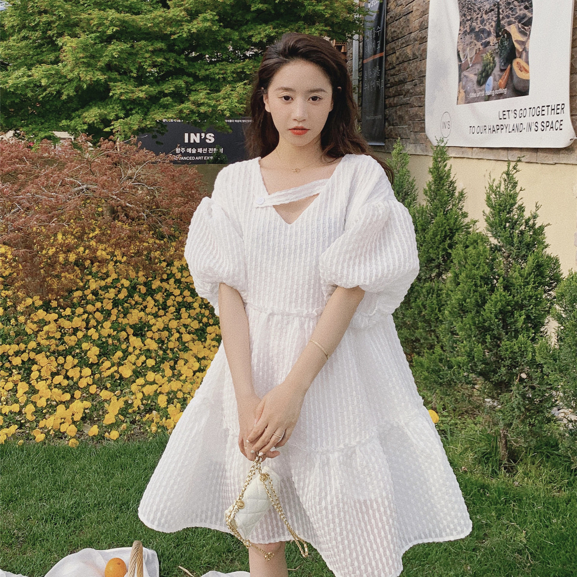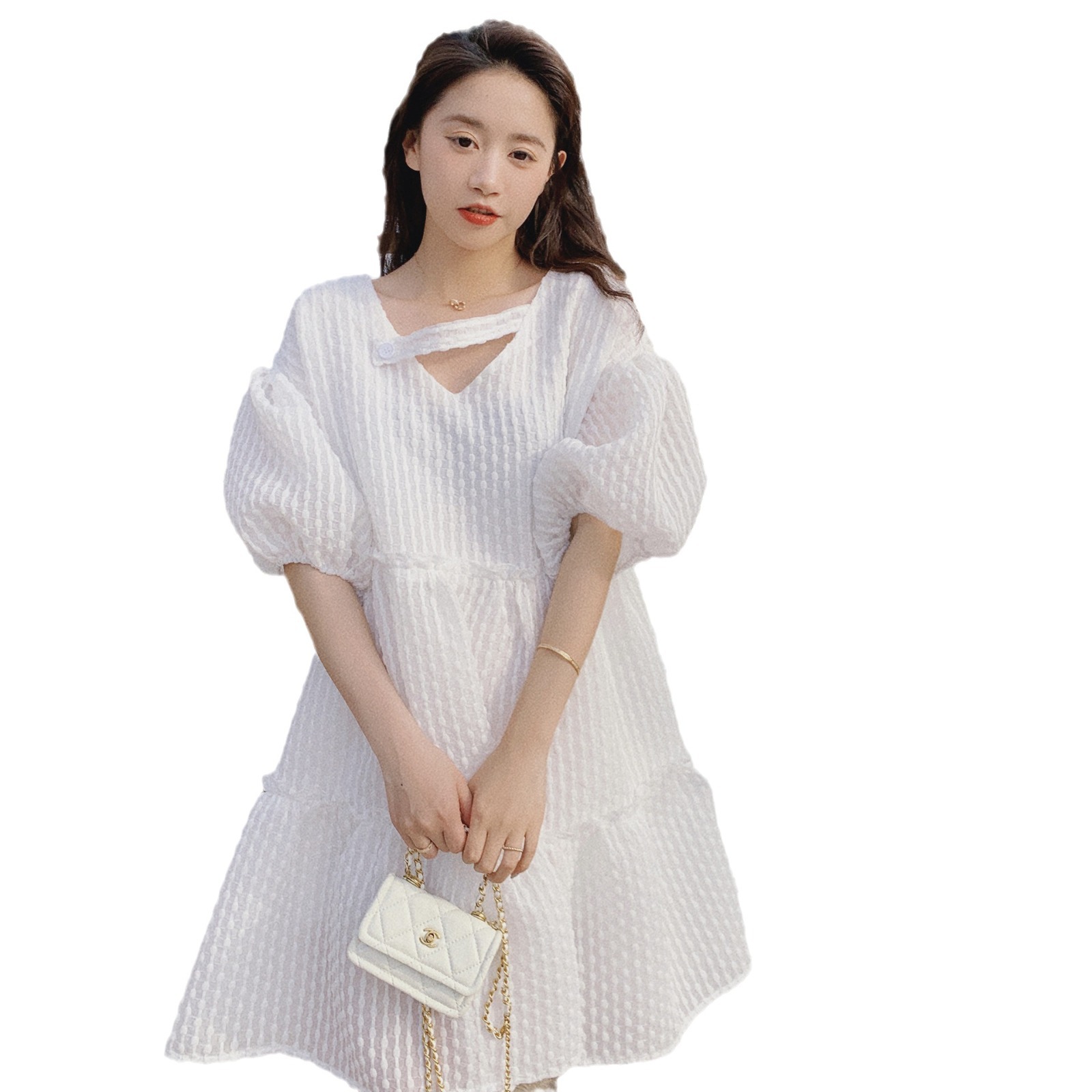 白色圆领连衣裙夏装新款修身泡泡袖前后两面穿V领气质连衣裙