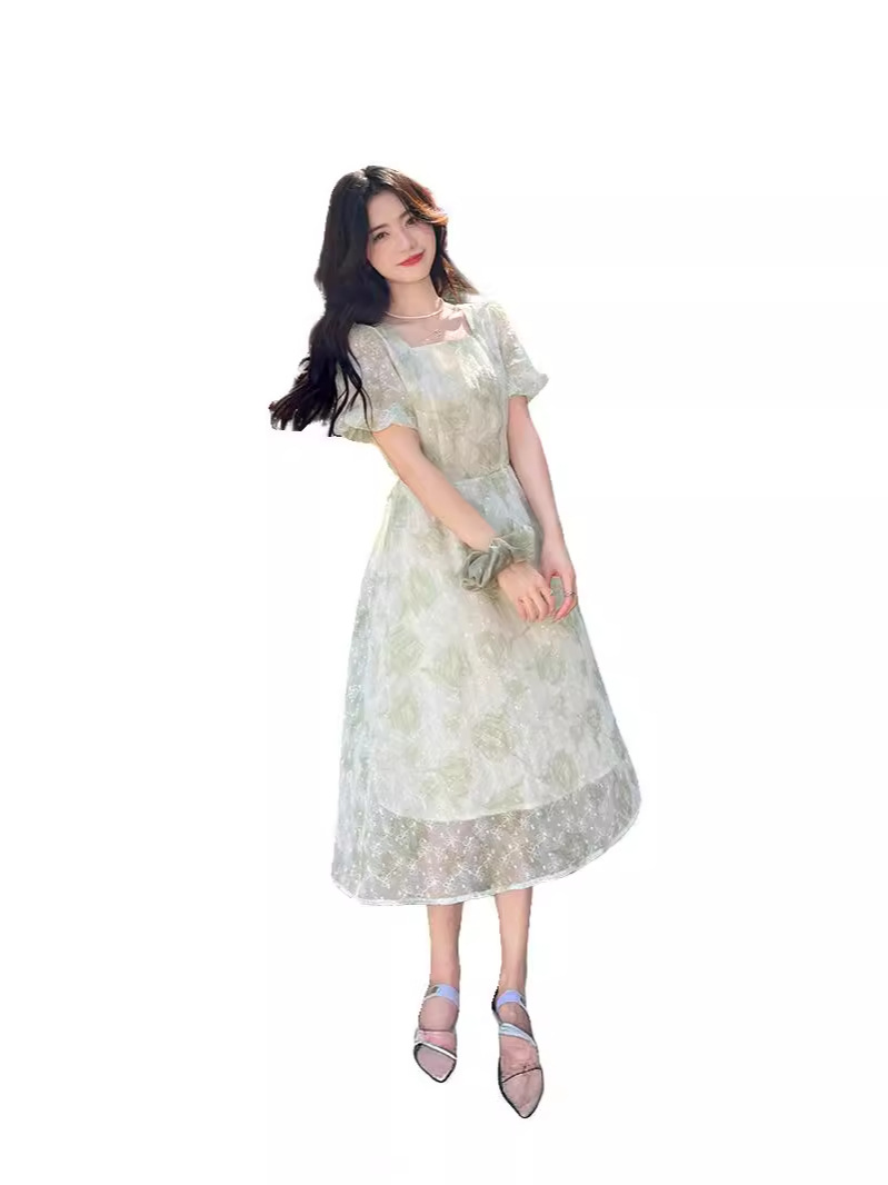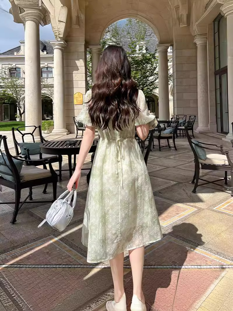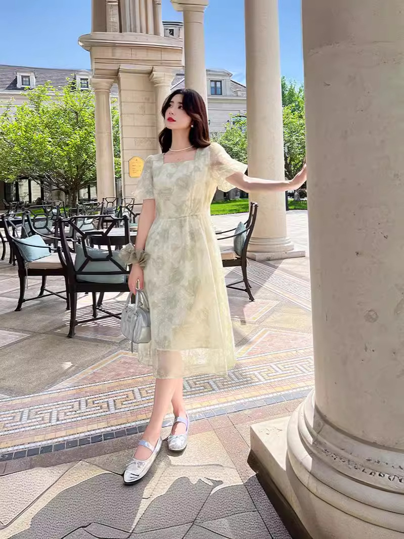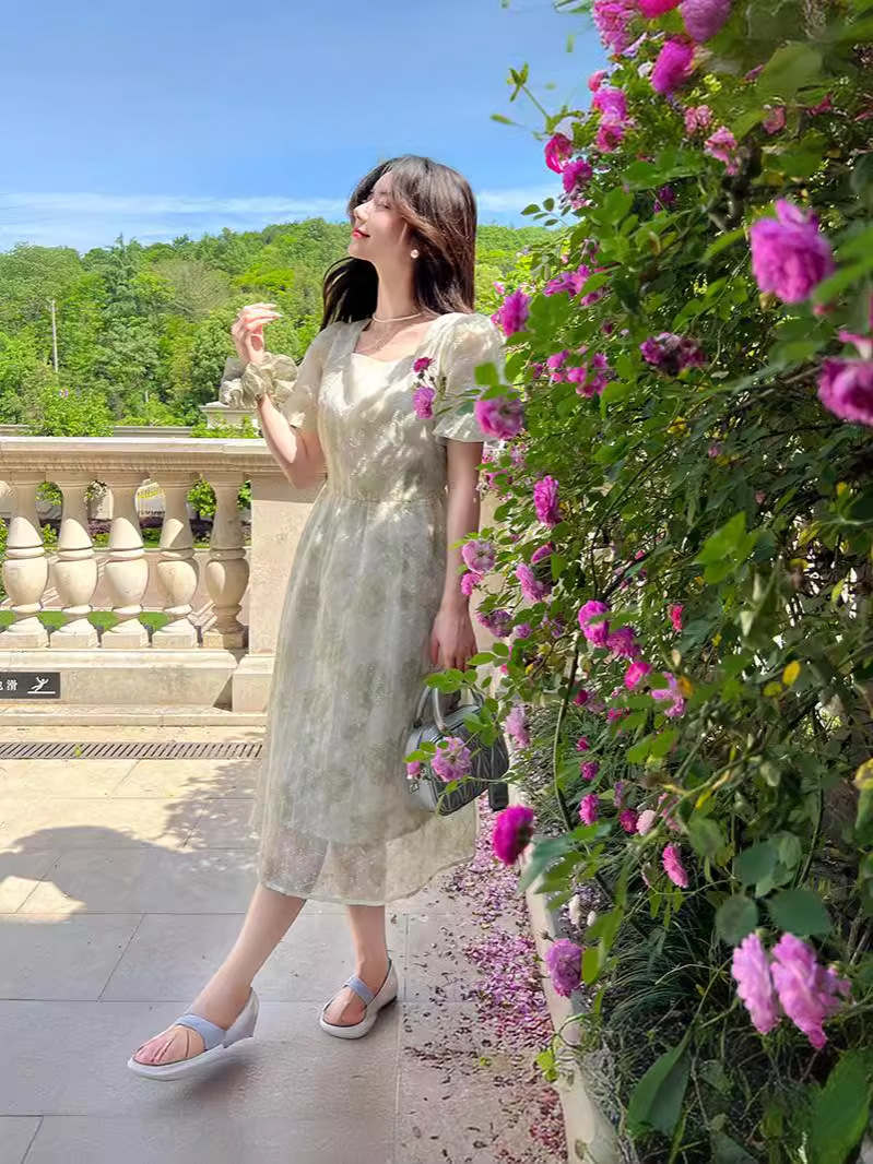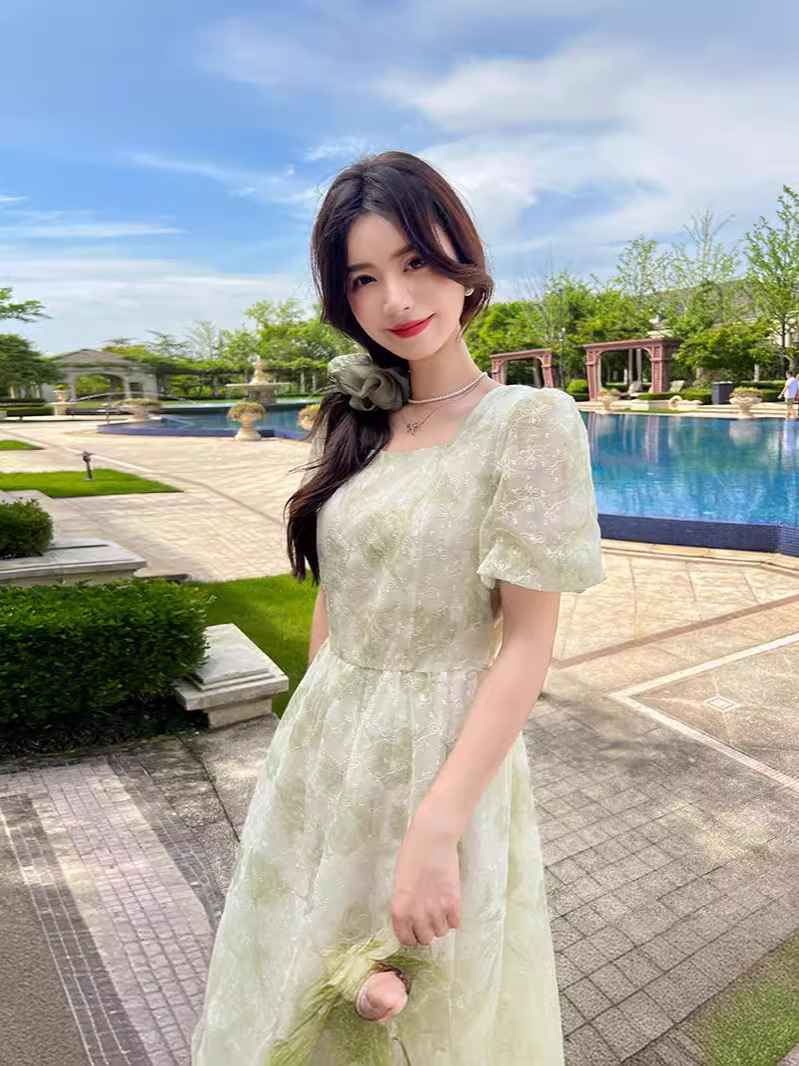 年夏季短袖大花灯笼袖法式方领 夏日微醺穿搭 精美刺绣连衣裙