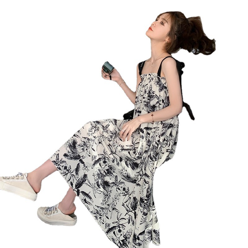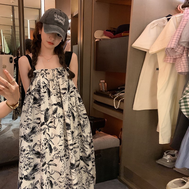 吊带撞色印花连衣裙夏夏装新款韩版修身无袖中长款圆领连衣裙